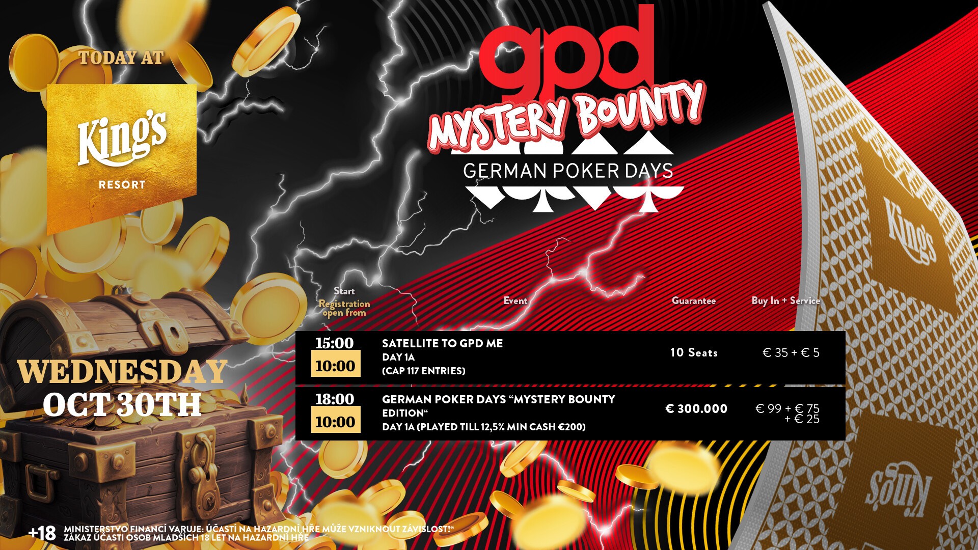 Nach dem Abschluss der WSOPC geht es im King’s Resort Rozvadov heute nahtlos mit der Mystery Bounty Edition der German Poker Days weiter. Für €99+75+25 ist man ab 18 Uhr an Tag 1A dabei und kann um garantierte €300.000 pokern.