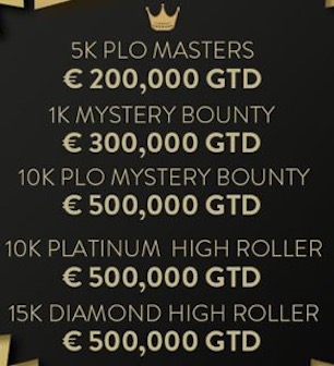 Das ursprünglich namensgebende €10k PLO Mystery Bounty Event startet am Mittwoch (16:00 Uhr). Für ein Startgeld von €6.700+€300+€3.000(Bounty) liegen mindestens garantierte €500.000 im Preispool des 2-Day-Events.