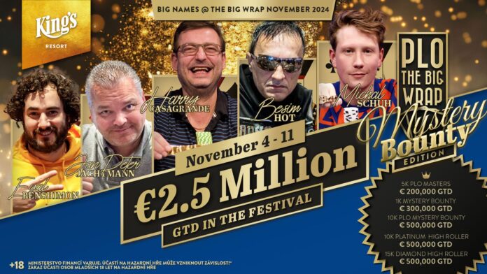 PLO-Liebhaber und High Roller aufgepasst! „The Big Wrap“ ist in der Mystery Bounty Edition zurück im King’s Resort Rozvadov. In den insgesamt 32 Turnieren ist diesmal für jeden etwas dabei, vom €50 MTT bis zum Diamond High Roller Event mit €15.000 Buy-In. Insgesamt sind €2.500.000 an Preisgeld garantiert. Und in der Mystery Bounty Edition sorgen gleich zwei MB Main Events für reichlich Bounty-Action!
