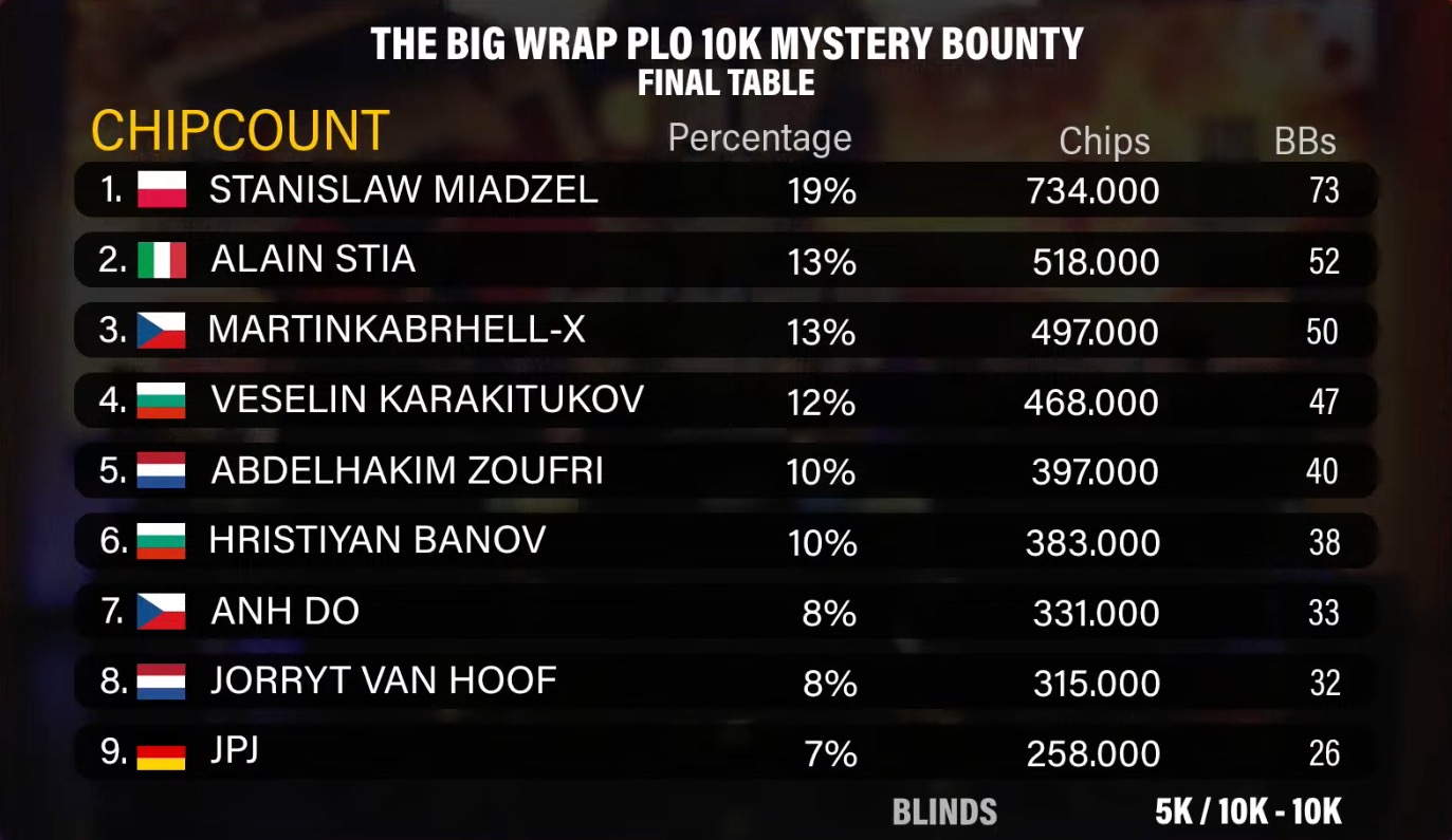 Die anschließend von Alain Stia gezogene Mystery Bounty war €12.000 Wert. Für den Italiener war es zudem erst die 2. ITM-Platzierung seiner Pokerkarriere, nach einem Cash bei der The Big Wrap Asgabe des Vorjahres.
