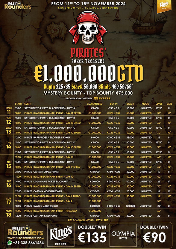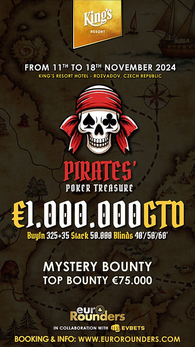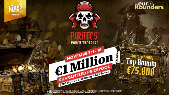 AYE! Die Piraten fahren mit der Pirates Poker Treasure powered by euroRounders vom 11. bis 18. November in das King’s Resort Rozvadov ein. Dabei bringen sie €1.084.600 an garantierten Schätzen mit, allein €1.000.000 für die Pirates Poker Party Blackbeard Mystery Bounty.
