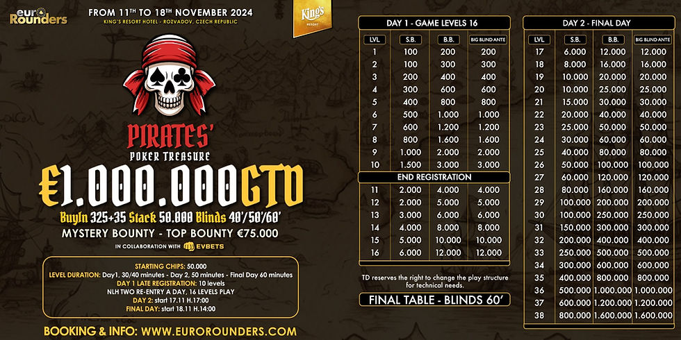 Gleich 9 Starttage (1A bis 1I) besitzt das Pirate Blackbeard Main Event. Bei einem Startgeld von €200+€125(Bounty)+€35 wird es sage und schreibe garantiert 1 Million Euro als Piratenschätze im Main Event geben. Zum Start pokern alle Pirat*innen mit 50.000 Chips los und haben dann entweder 40 Minuten (regulär), 30 (Speed) oder 15 (Turbo) Minuten Spielzeit in den Blindleveln. In den ersten 10 davon gibt es die Option auf unlimited Re-Entrys.