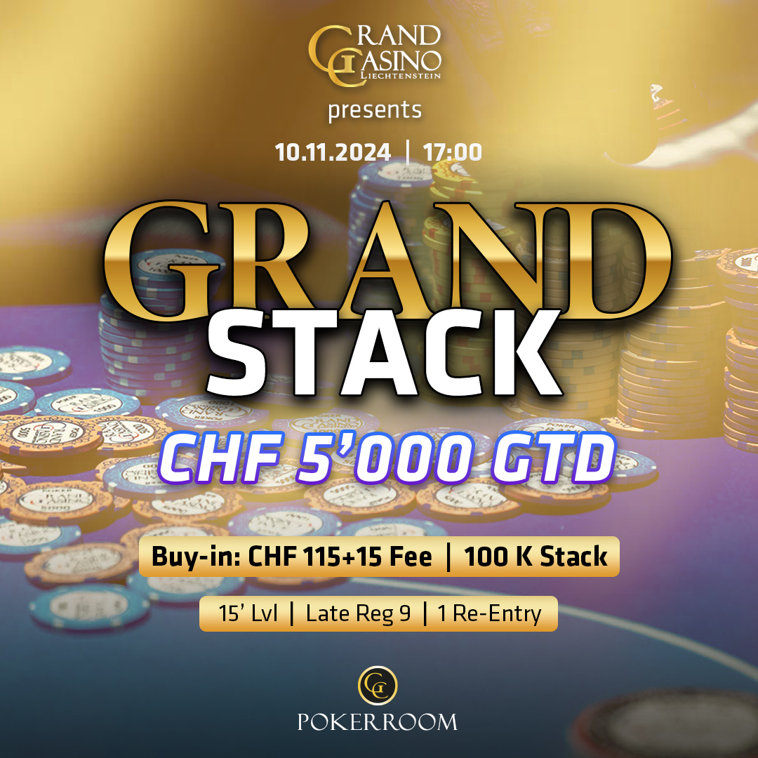 Im Grand Stack geht es heute ab 17:00 Uhr für 115+15 CHF Startgeld um mindestens garantierte 5.000 CHF. Im Kampf darum erhalten die Starter*innen jeweils großartige 100.000 Starting Chips und 15 Minuten Spielzeit pro Level. 1 Re-Entrys ist in den ersten 9 Leveln möglich.