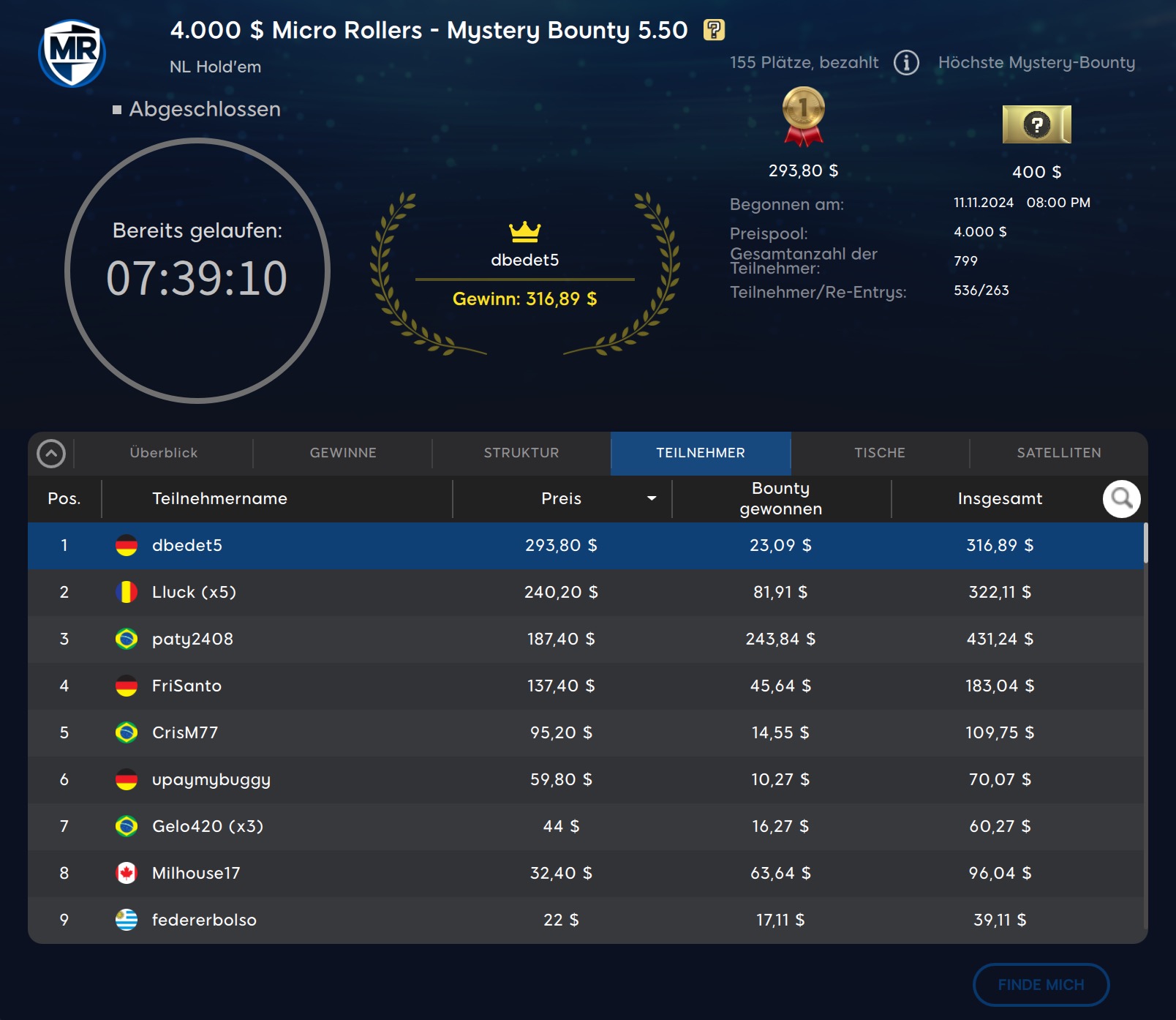 Deutsche Siege gab es u.a. durch „EinfachBesse“ ($872) im $4.000 Mystery Bounty 8,80 und durch „dbedet5“ im $4.000 Mystery Bounty 5,50 zu verzeichnen.