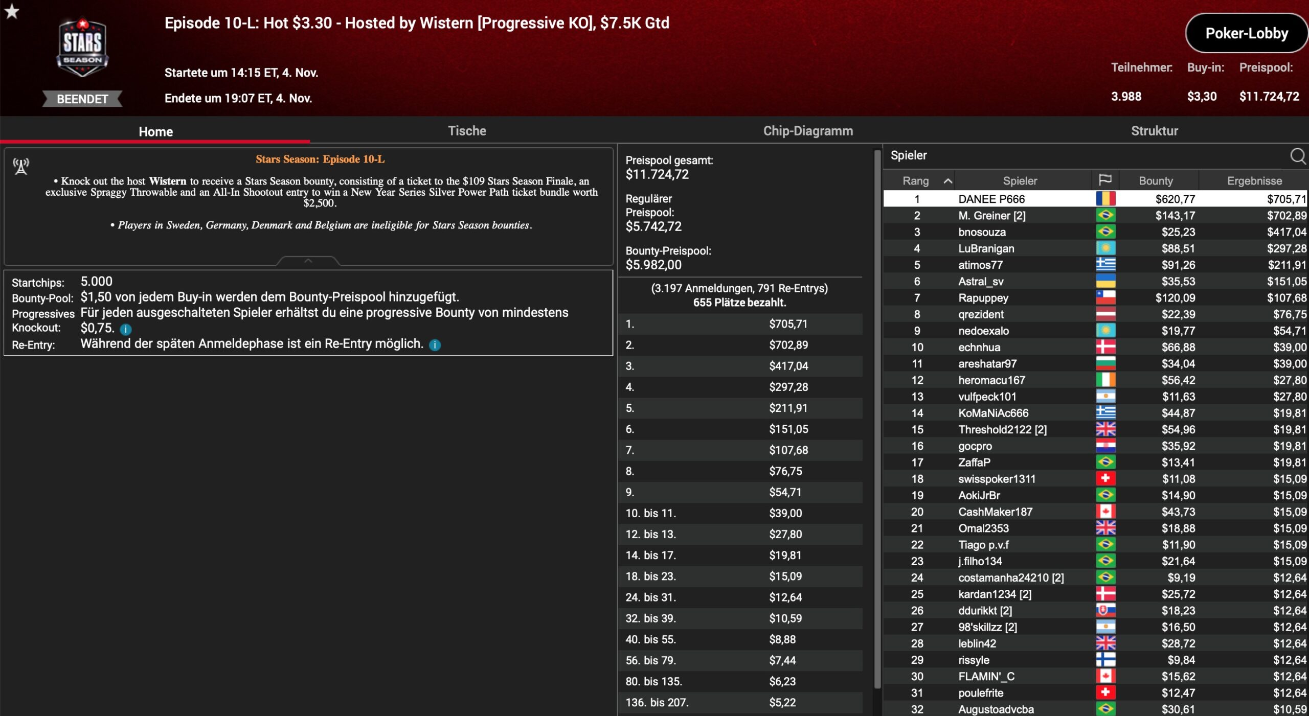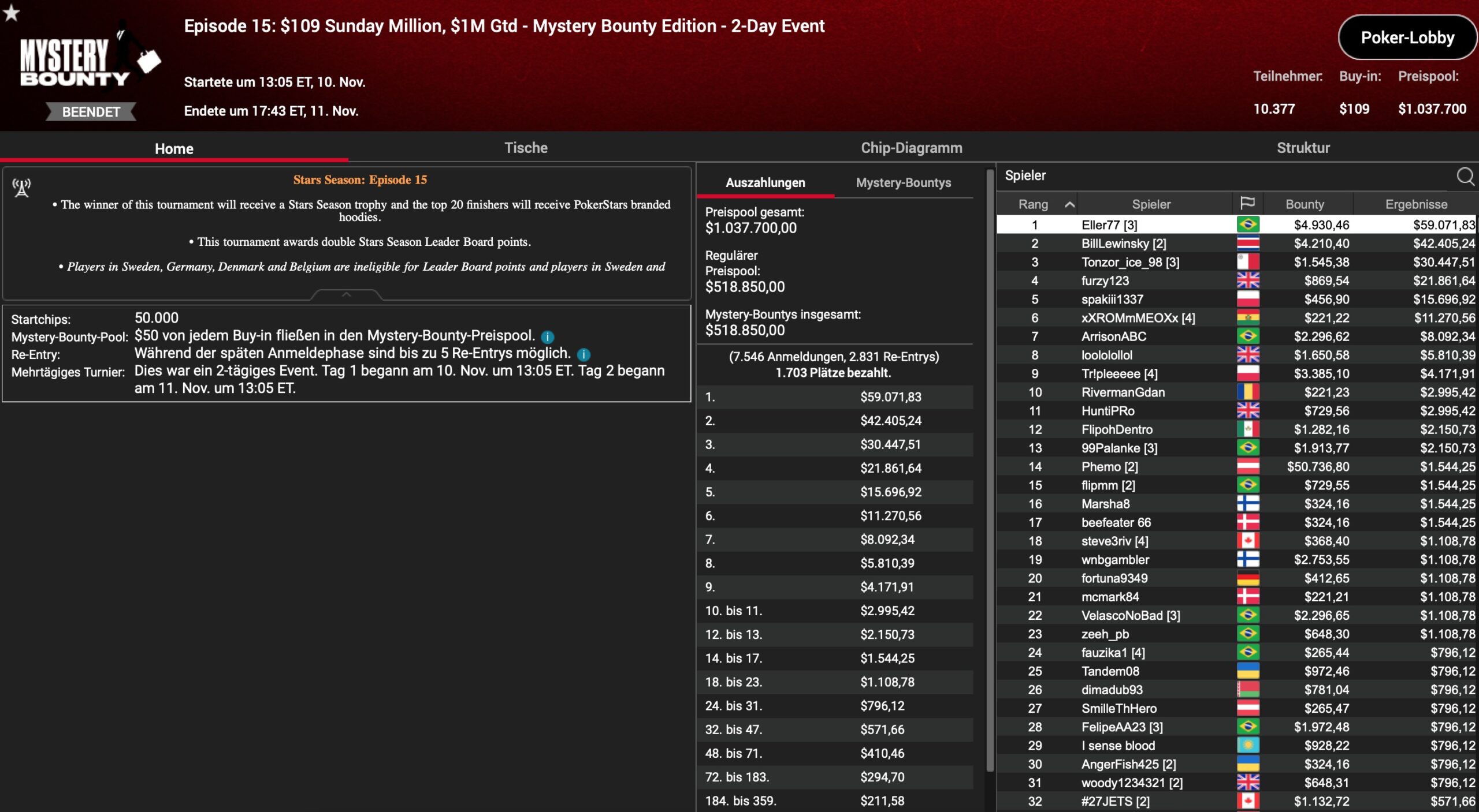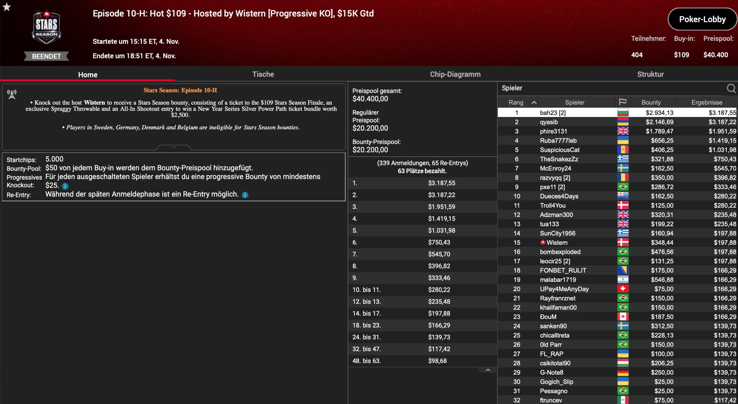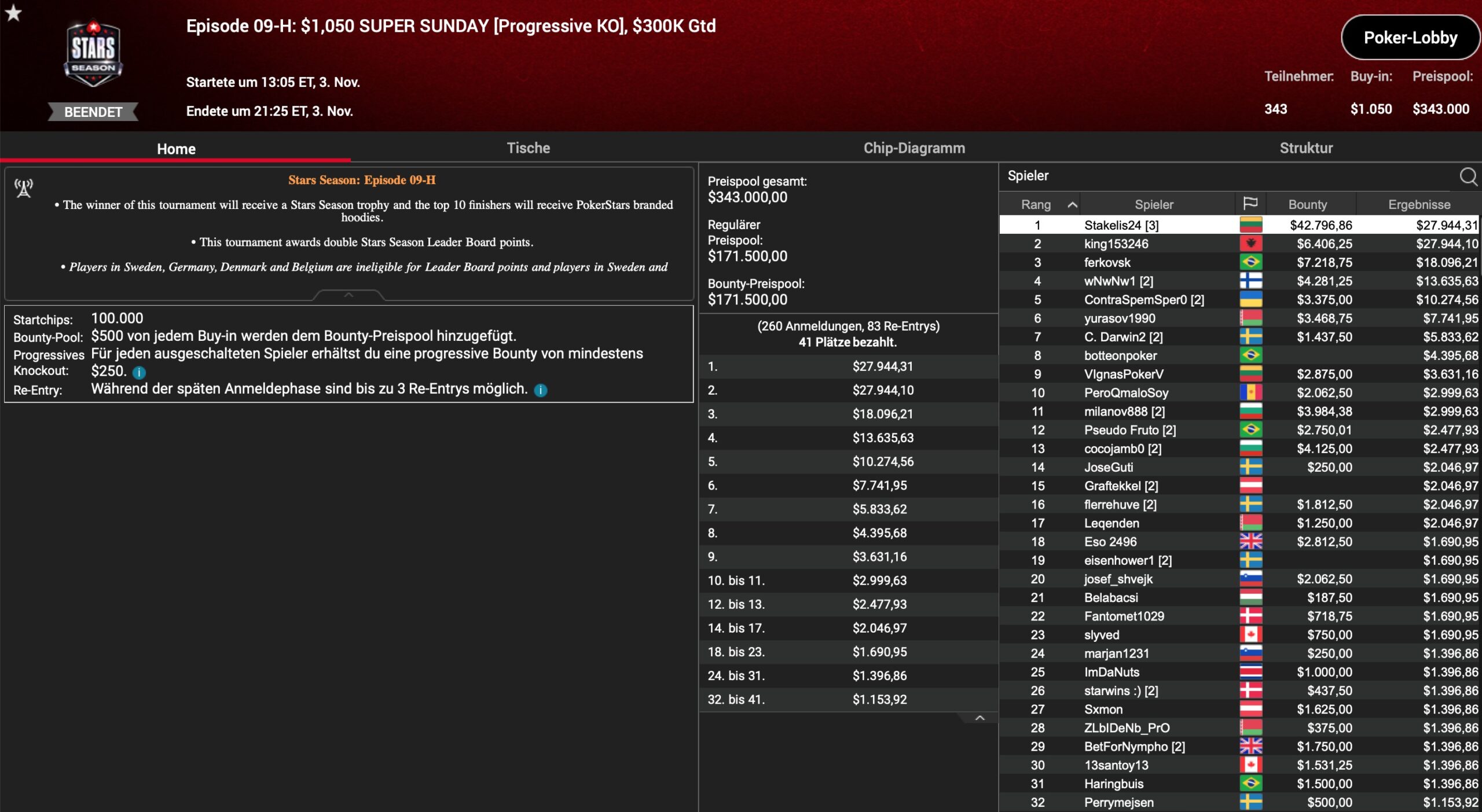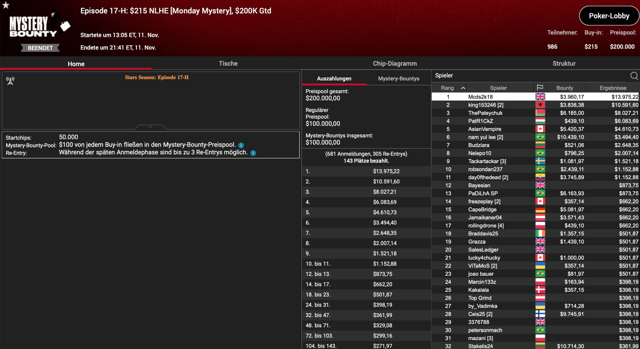 | Teilnehmer | Buy-In | Preispool |