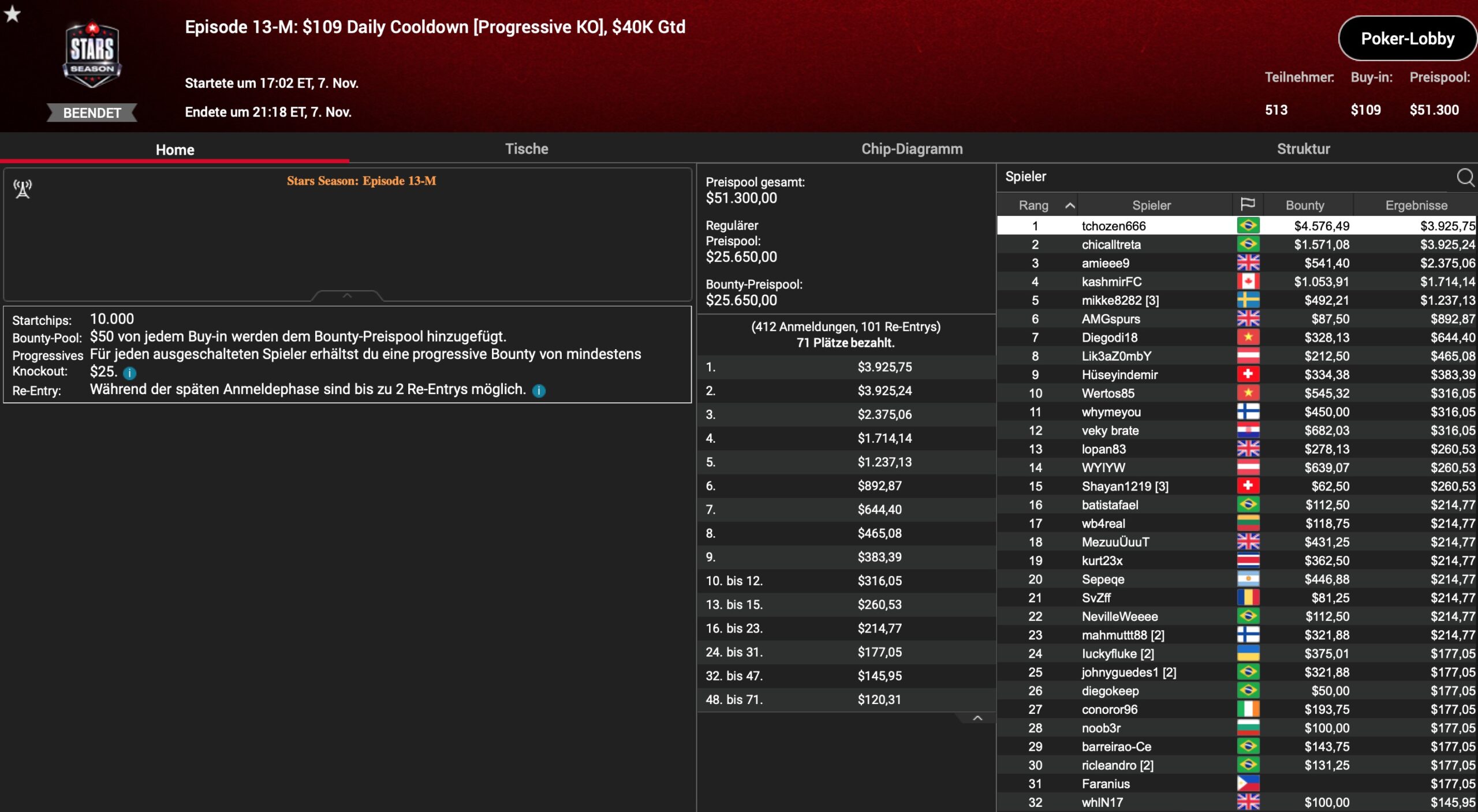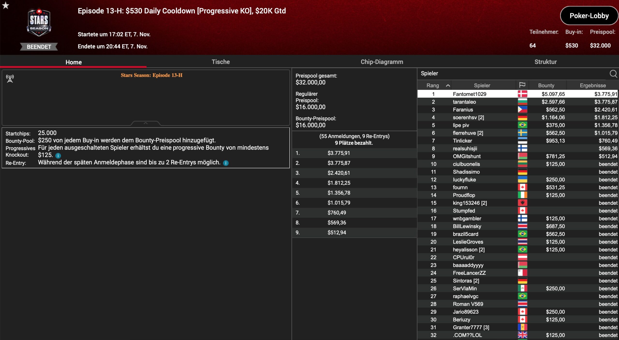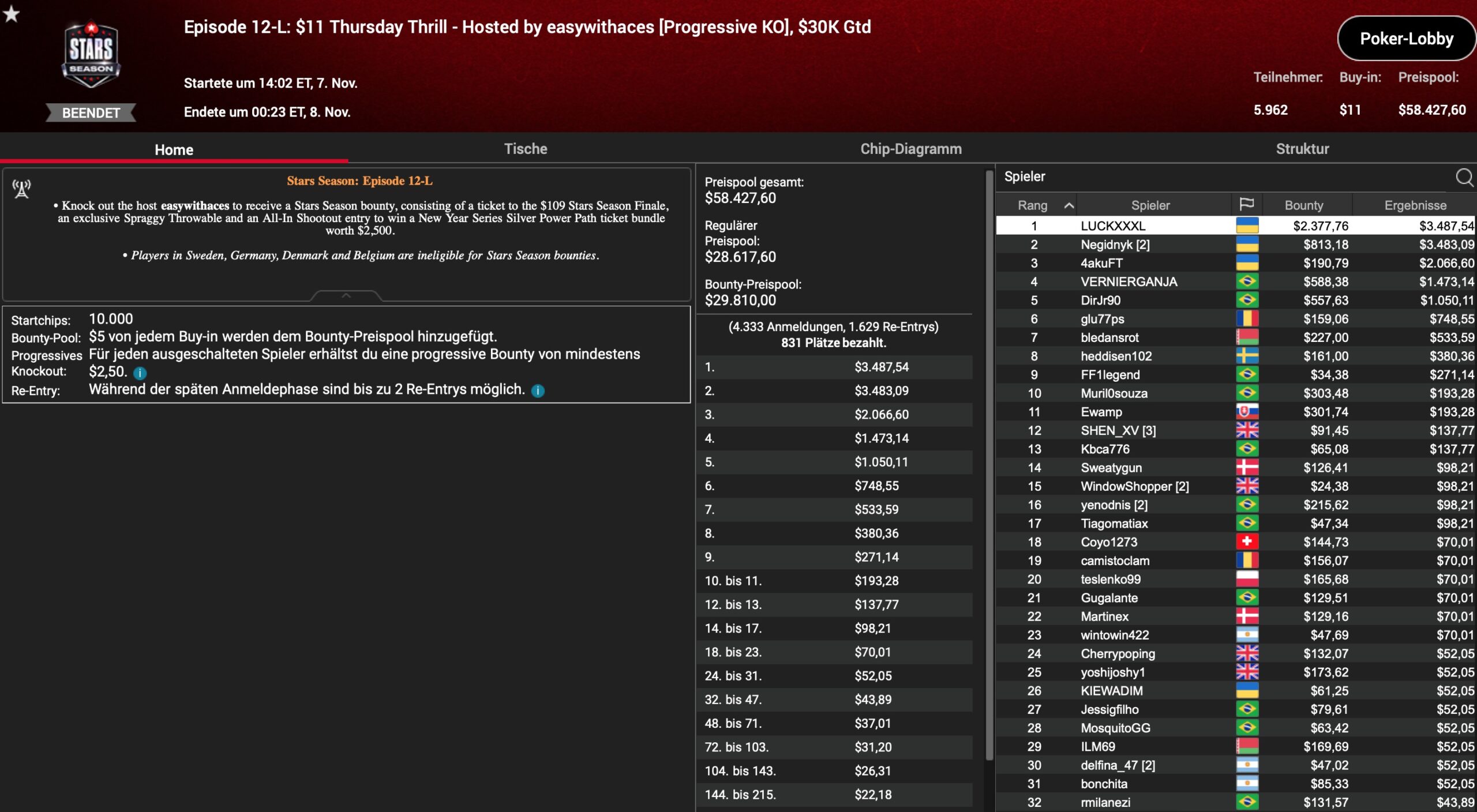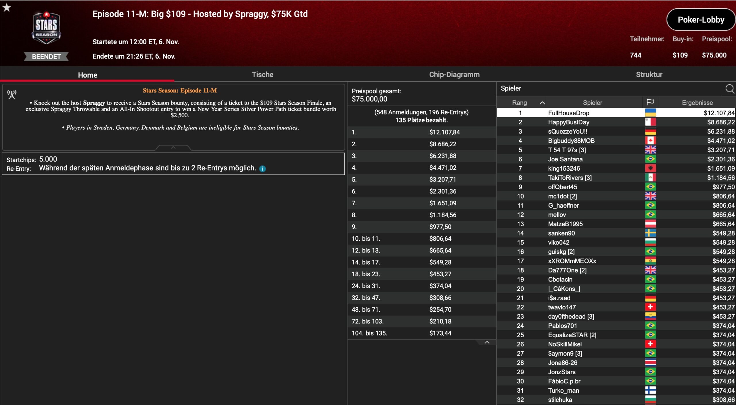 | Teilnehmer | Buy-In | Preispool |