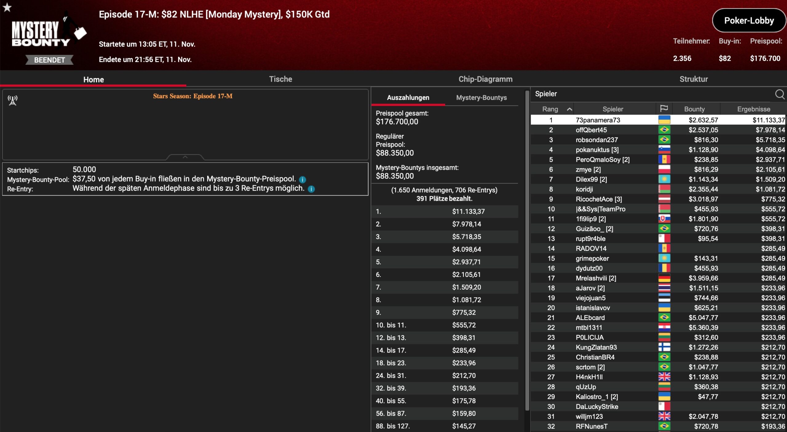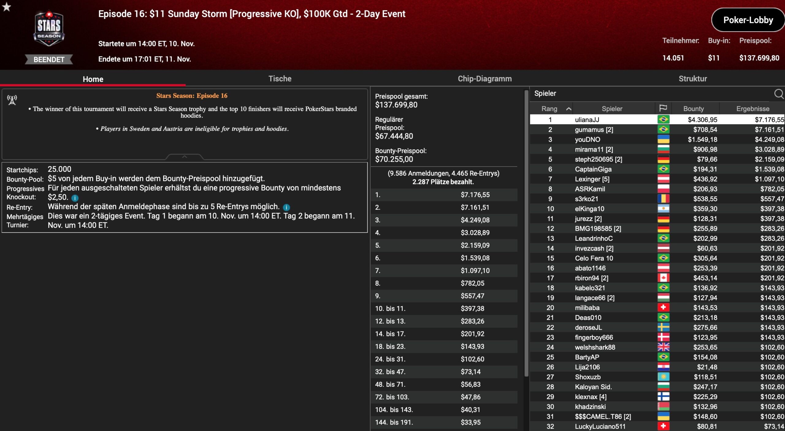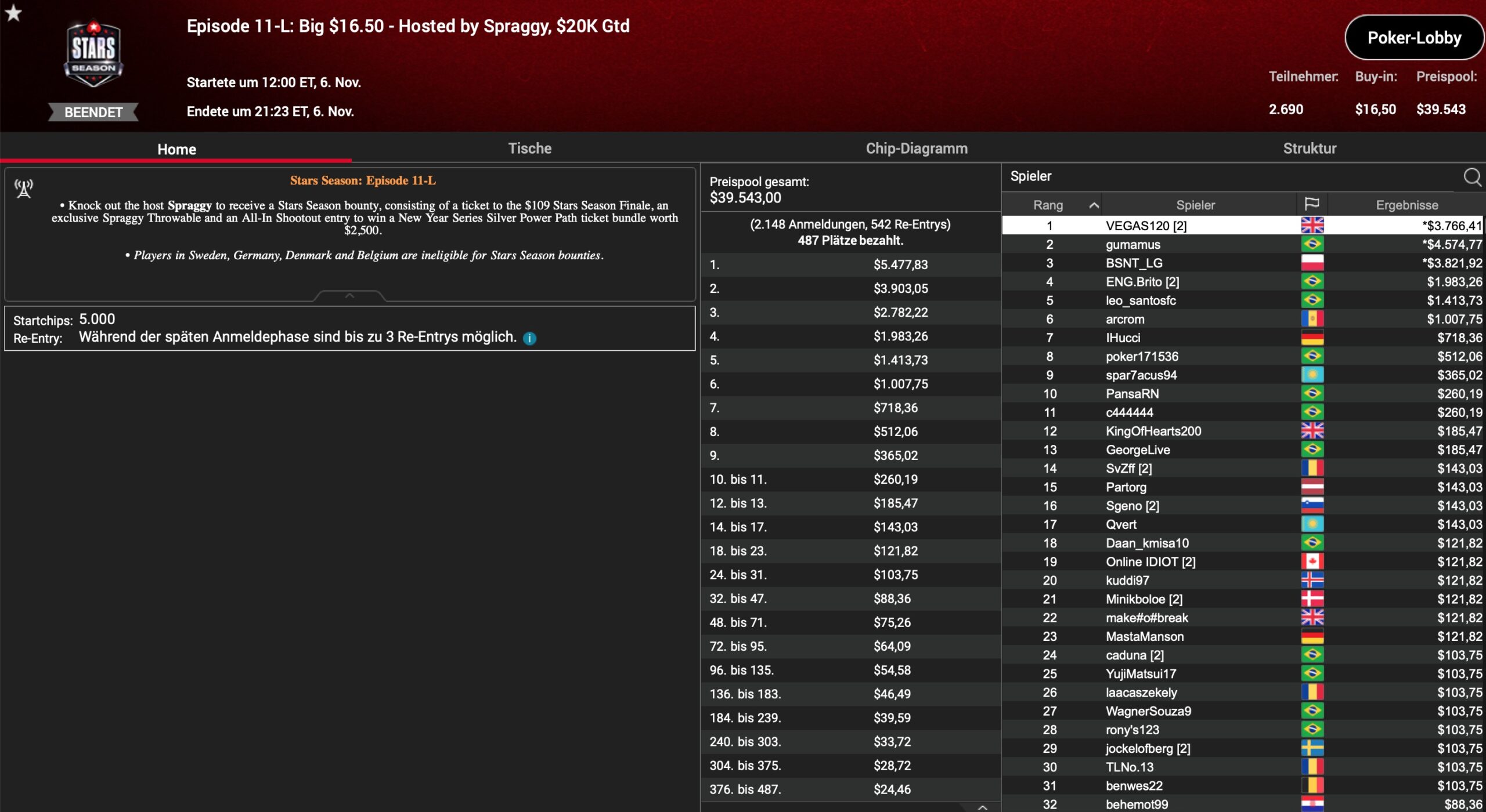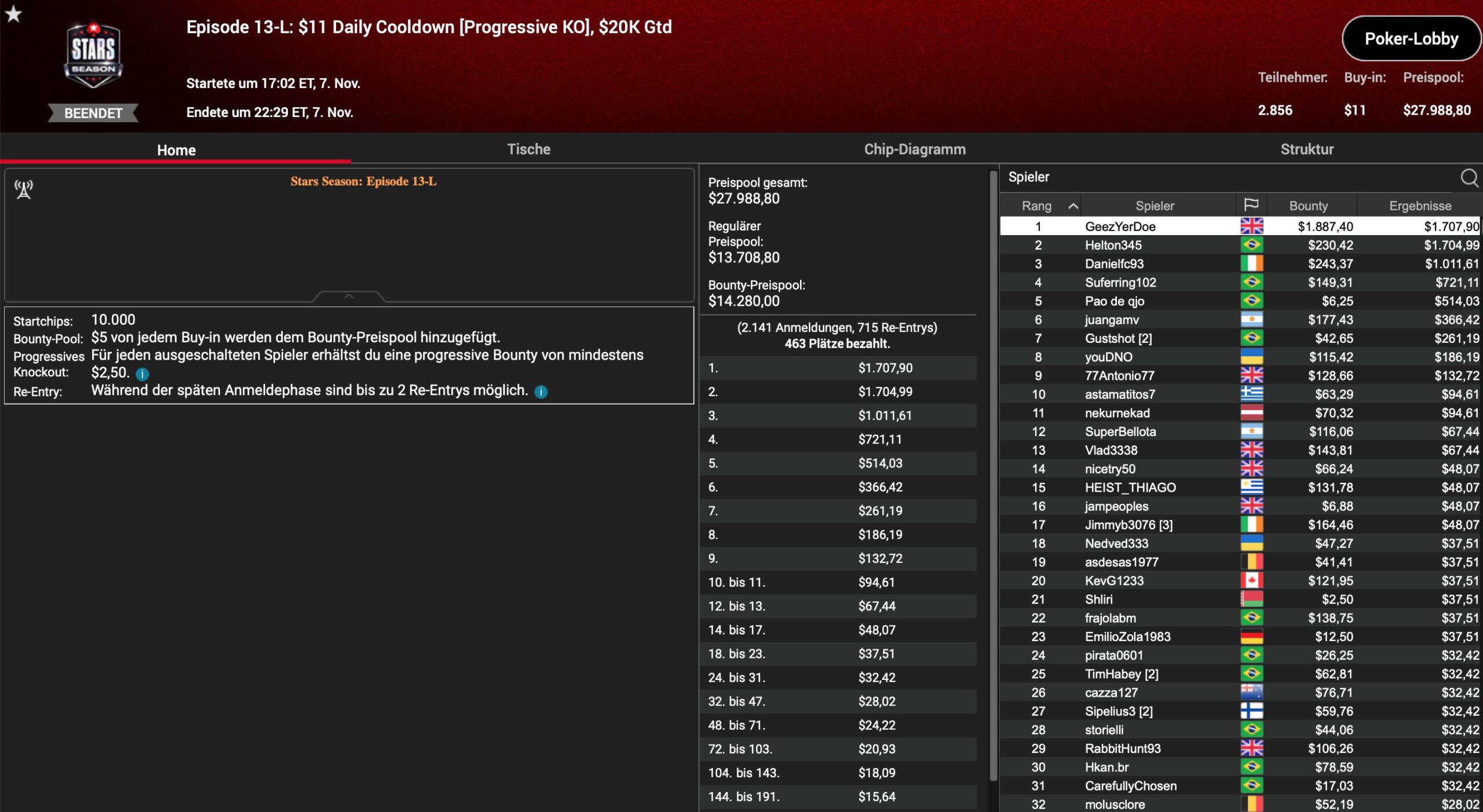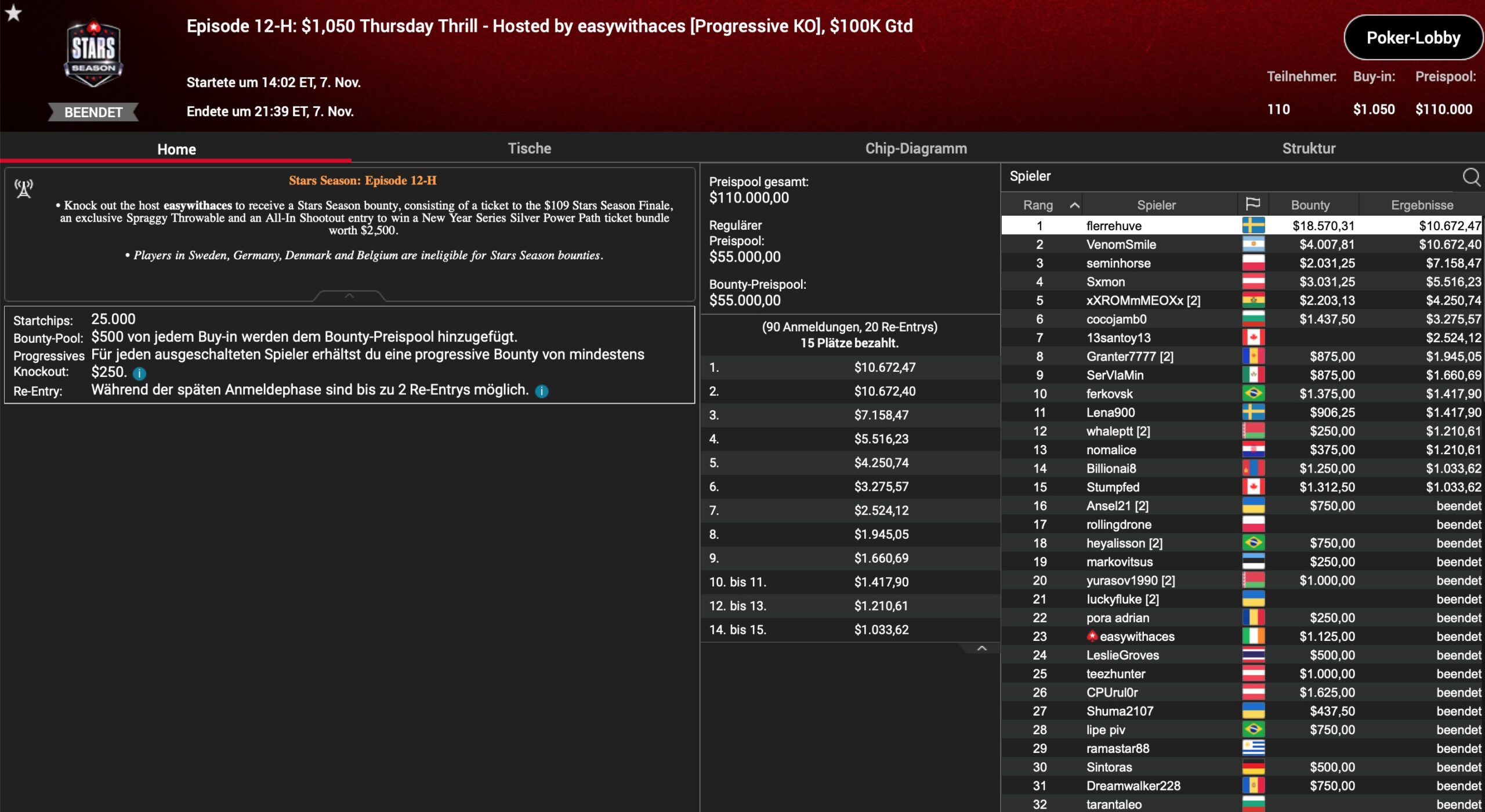 | Teilnehmer | Buy-In | Preispool |