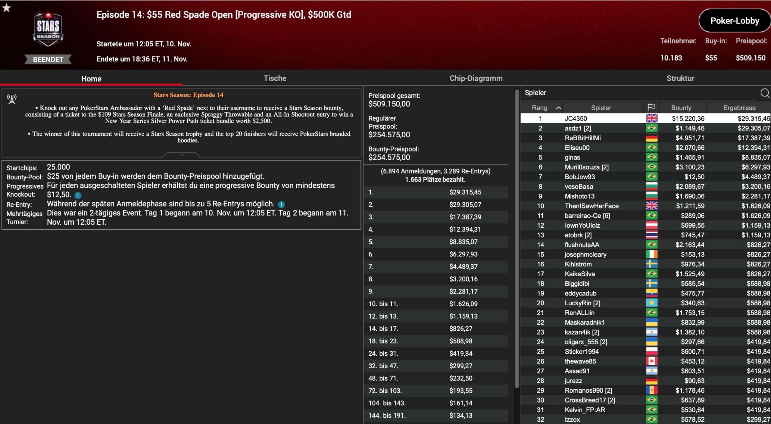 PokerStars Stars Season – Spielplan