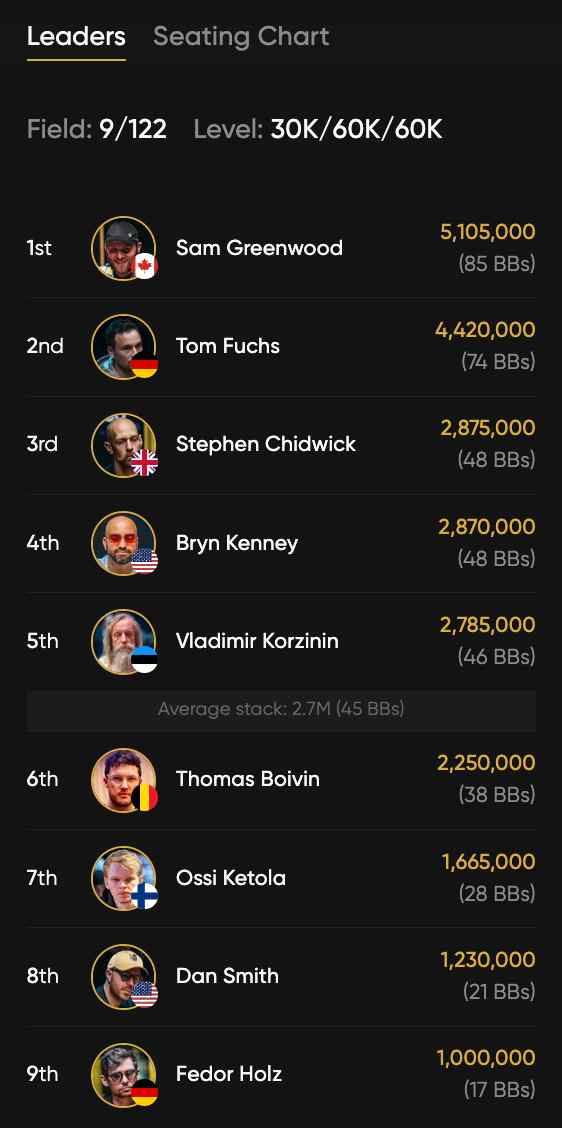 Angeführt wird das Turnier von Sam Greenwood aus Kanada, der 5,1 Mio. Chips hat. Er wird dicht gefolgt von Tom Fuchs aus Deutschland mit 4,42 Mio. Chips.