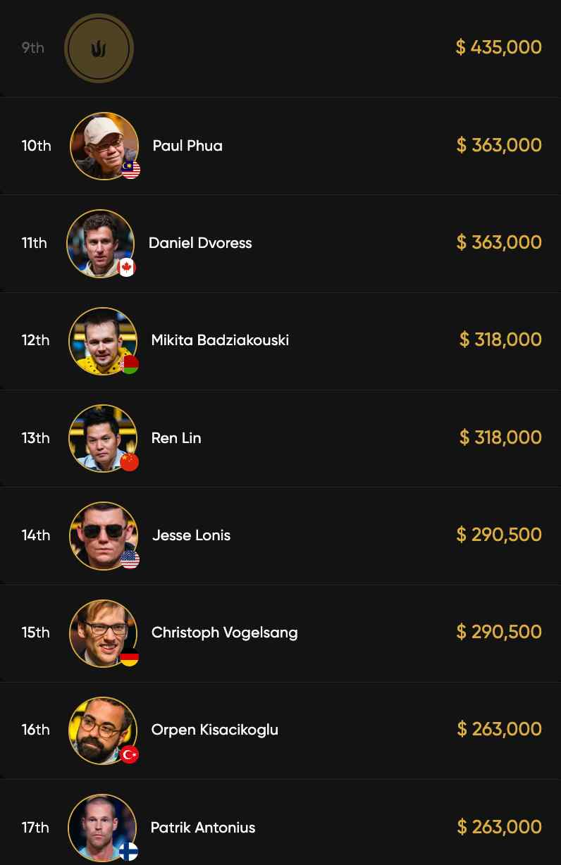 Mit Abstand sitzt Stephen Chidwick mit 2,87 Mio. hinter dem Führungsduo. Fedor Holz sitzt am Ende der Tabelle mit 1 Mio. Chips. Bei den aktuellen 30k/60k/60k (Ante) Blinds sind das noch 17 Big Blinds.