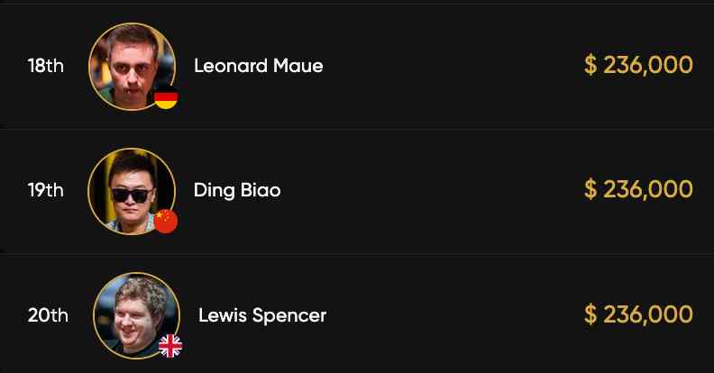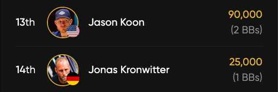 Auch hier sitzt am Ende der Tabelle ein DACH-Spieler. Jonas Kronwitter hat nur einen Big Blind übrig – er muss einige Male aufdoppeln, um noch eine Chance zu haben. Alle Spieler haben den Min-Cash in Höhe von $78.000 sicher.