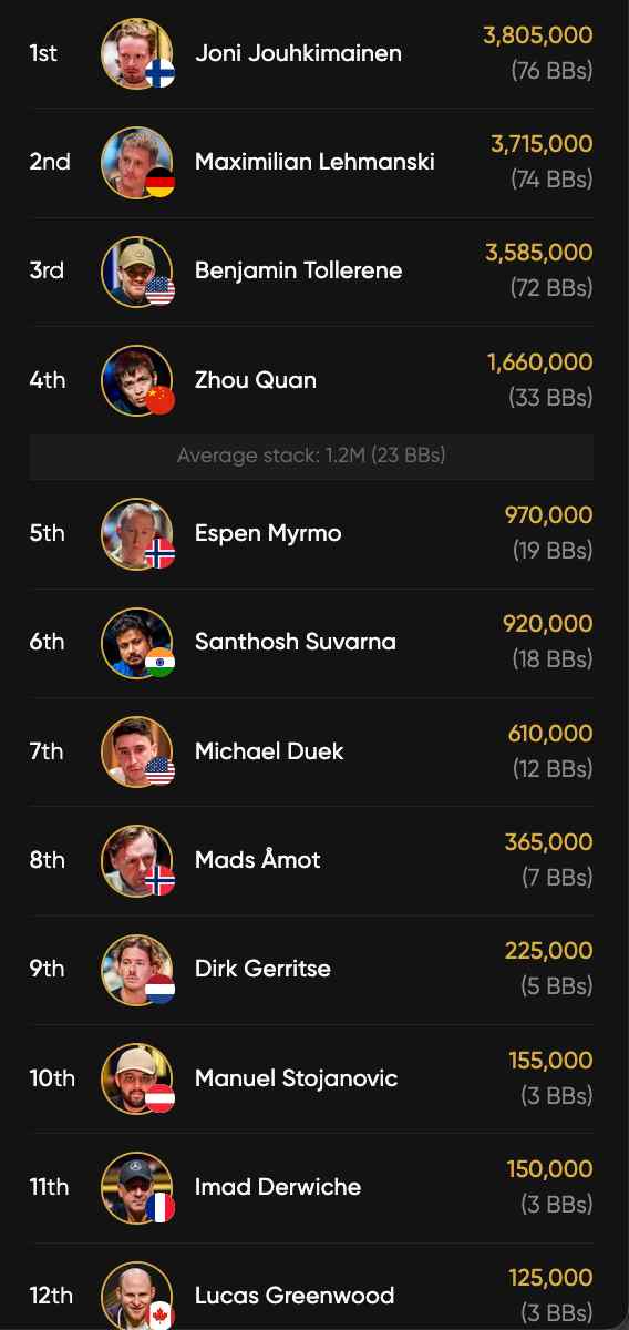 Joni Jouhkaminaen aus Finnland steht dem Feld mit 3,8 Mio. Chips vor. Maxi Lehmanski aus Deutschland hat mit 3,7 Mio. Chips nur ein paar Chips weniger.