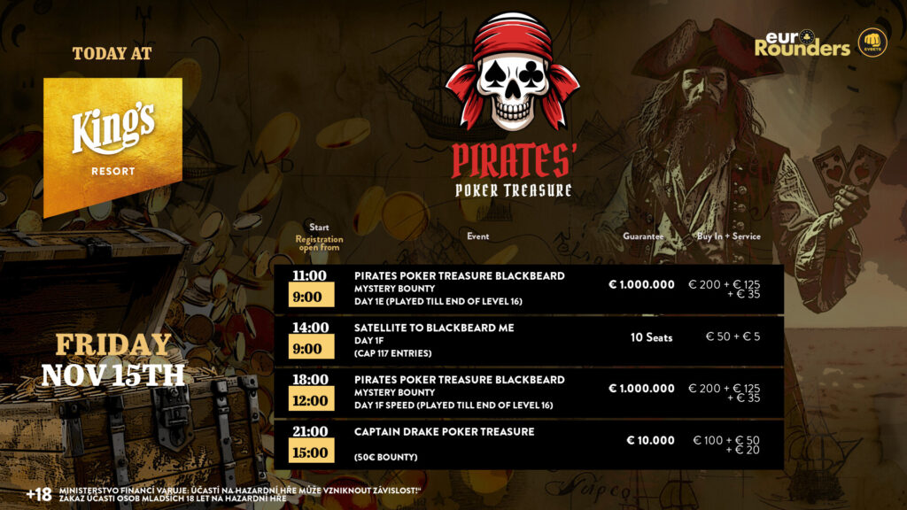 Heute geht es im King’s Resort Rozvadov bereits um 11 Uhr weiter mit dem Tag 1E und um 18:00 Uhr mit dem Tag 1F Speed des €360 Pirates Poker Treasure Blackbeard Mystery Bounty Events. Um 14:00 Uhr gibt es auch die Möglichkeit, sich günstiger für das Event zu qualifizieren mit einem €55 Satellite. Zum Abschluss steht heute Abend um 21:00 Uhr noch das €170 Captain Drake Poker Treasure Bounty Event (€10k GTD) auf dem Programm.