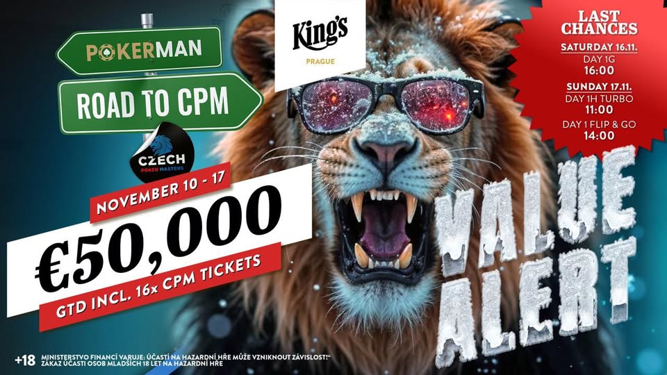 Im King’s Casino Prag gab es den sechsten Starttag des €80+10 Road to CPM Turniers. Insgesamt gab es hier 106 Entries (67 plus 39 Re-Entries). Elf Spieler schafften es weiter in den Finaltag am Sonntag, allen voran der Ukrainer Valerii Kalynych, der außerdem den Chipleader-Bonus von €500 (KOK-Ticket) erhielt.