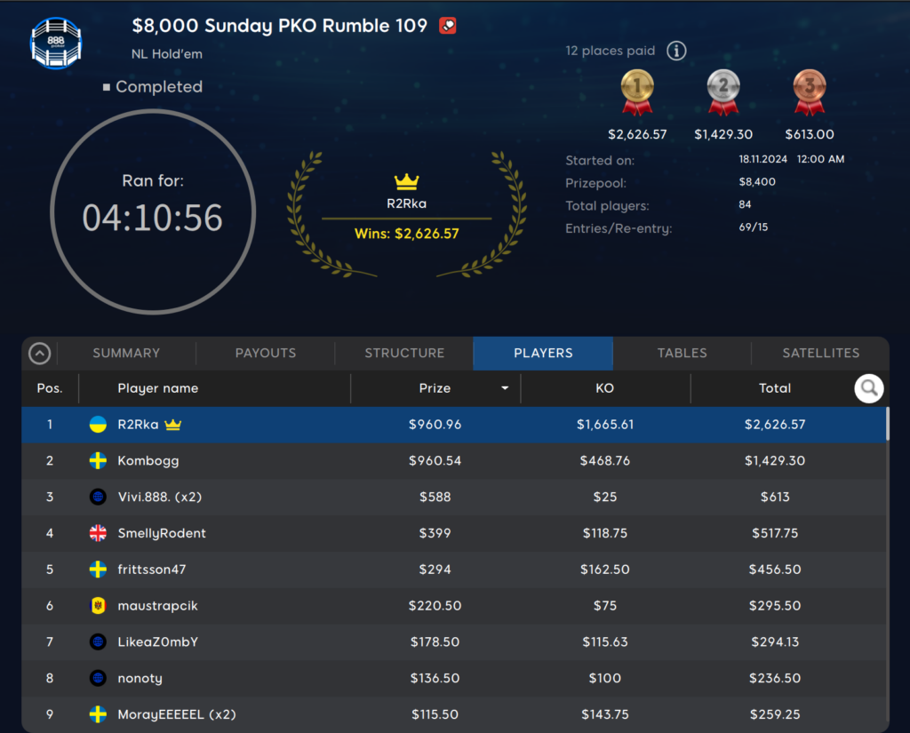 Im $109 Sunday PKO Rumble ($8k GTD) gab es 84 Entries und somit einen $8.400 Preispool. Zwölf Plätze wurden bezahlt und der Großteil ging an den Ukrainer ‚R2Rka‚ mit $2.626 und $1.665 an Bounties.