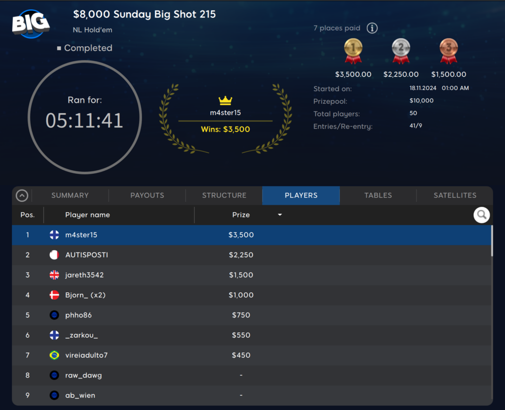 Das $215 Big Shot ($8k GTD) fand 50 Entries und somit wurde ein Preispool von $10.000 gebildet. Hier war es der Finne ‚m4ster15‚, der den Top-Preis von $3.500 mit nach Hause nehmen konnte.