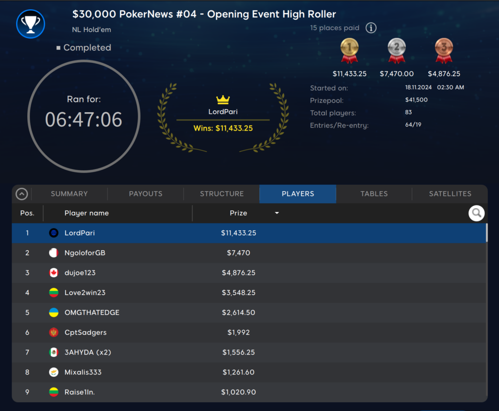 Gestern startete auch die PokerNews Online Championship und so schauen wir uns hier zum Beispiel das Event #4 an, das Opening Event High Roller mit einer $30.000 Garantie. Es gab 83 Entries und somit einen Preispool von $41.500. Der Top-Preis von $11.433 ging an ‚LordPari‚.