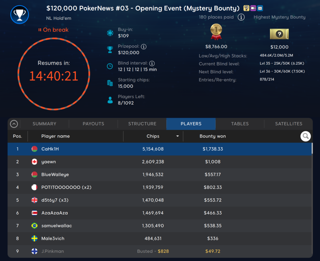 Das $109 PokerNews #03 – Opening Event (Mystery Bounty) fand insgesamt 1.092 Entries, von denen noch acht Spieler für das heutige Finale übrig sind. Die Garantie für das Event konnte nicht erreicht werden und so wird um einen $120.000 Preispool gespielt. Dabei wird der Sieger mit $8.766 plus Bounties nach Hause gehen können. Es ist kein DACH-Spieler mehr dabei. Chipleader für das Finale ist der Belarusse ‚CaHk1H‘.