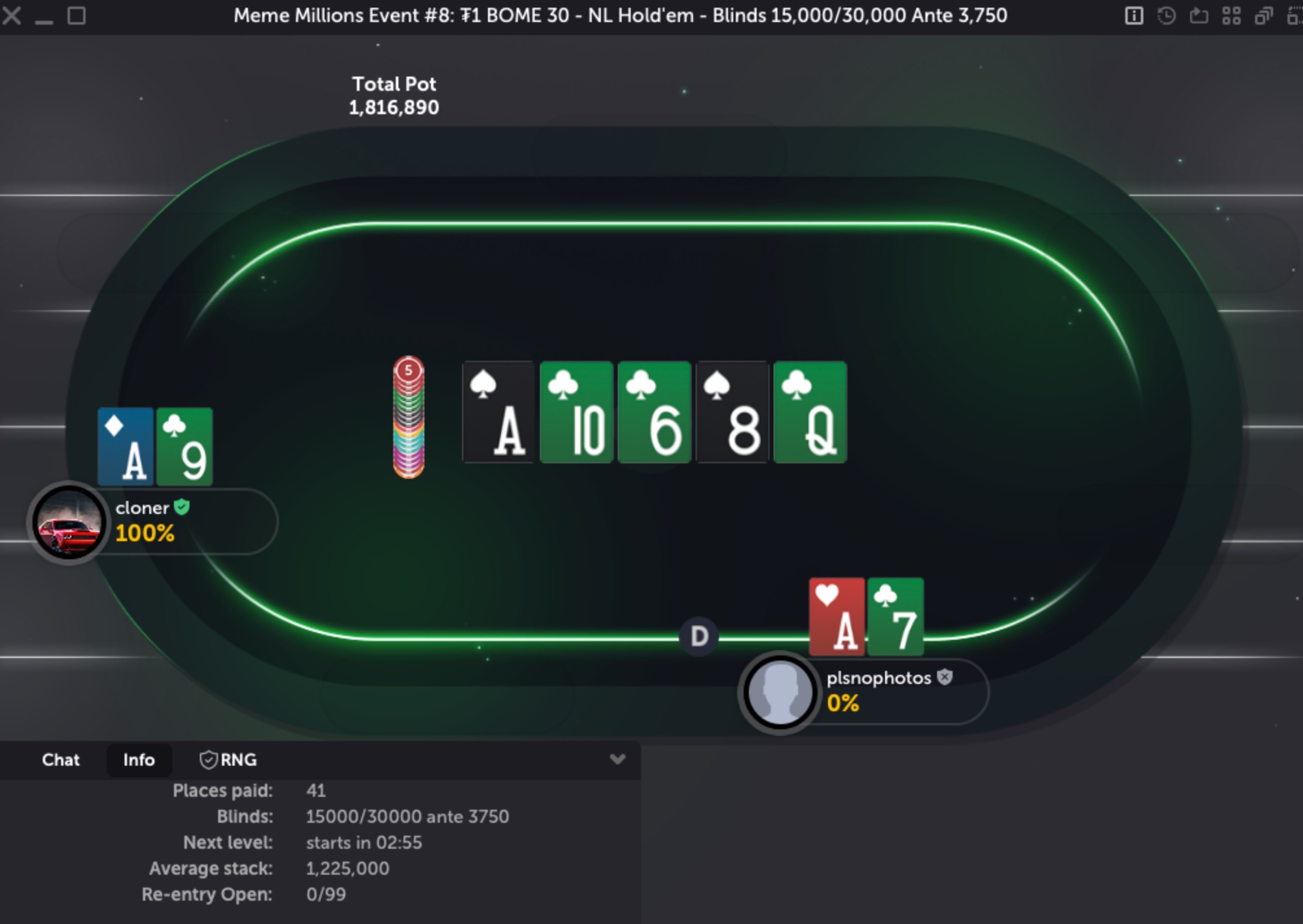 Nach 4 Stunden 33 Minuten Spielzeit wurde die finale Hand gedealt. Mit A7o lag „plsnophotos“ denkbar knapp hinter A9o von „cloner“. Am Turn stand fest, dass es keinen Spilt Pot geben würde, zudem erwischte beide Kontrahenten einen Gutshot, zu dessen Vervollständigung sie jeweils die Beikarte des anderen brauchten. Keiner der Draws kam an, und so kickte die 9 von „cloner“, der sich neben den Bragging Rights für den MEME Millions Erfolg $76 Siegprämie schnappte, während für $55 um 01:38 Uhr in den Account des Runner-Ups wanderten.
