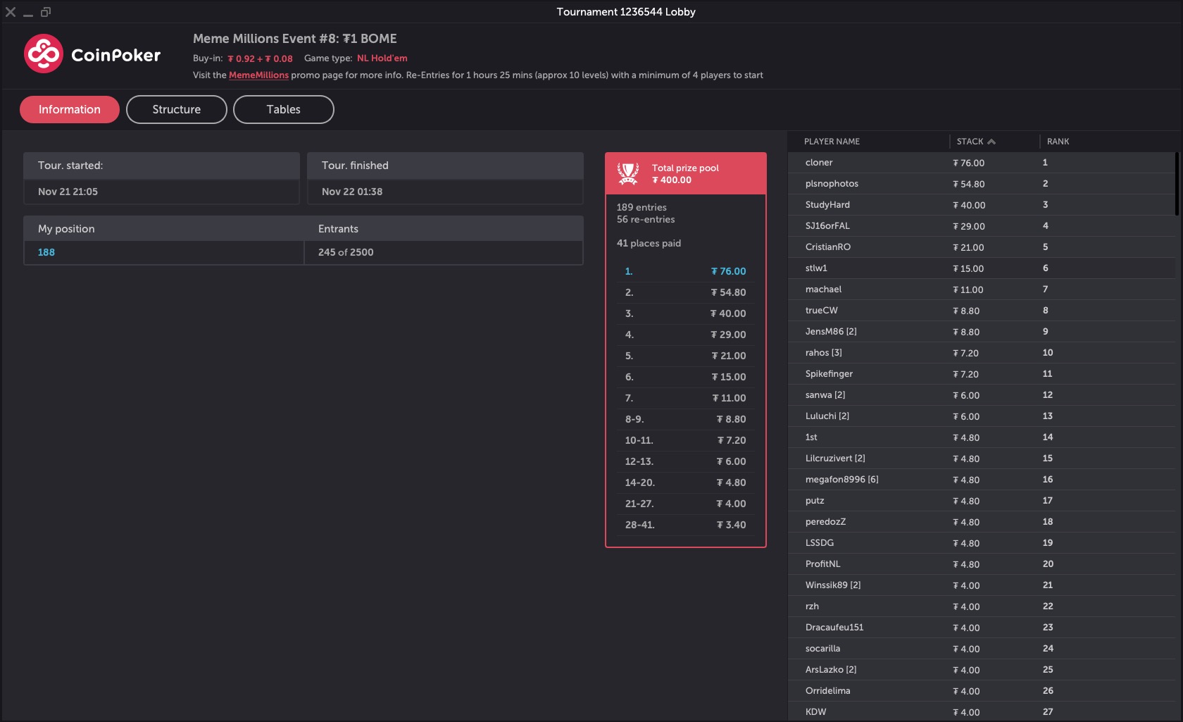 In Event #8, dem $1 BOME kamen 189 Entrys und 56 Re-Entrys zusammen, womit sich die Teilnehmer über ein deutliches Overlay in dem Event mit dem kleinsten Startgeld freuen konnten. 41 Plätze sollten bezahlt sein, und auf den Sieger sollten $76 warten.