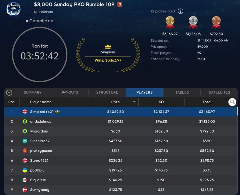 Mit Ian „Simpion“ Simpson trug sich auch ein 888poker-Ambassador in die Siegerliste ein. Er holte sich das $109 Sunday PKO Rumble.