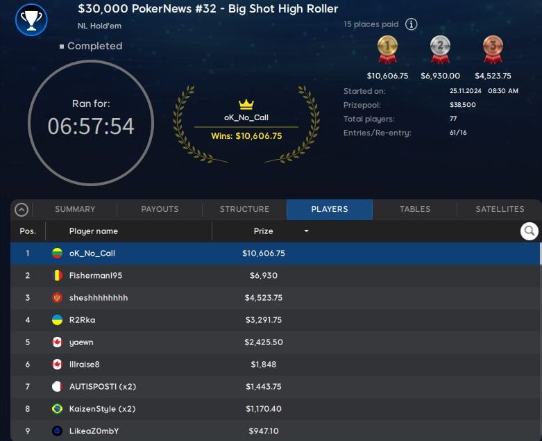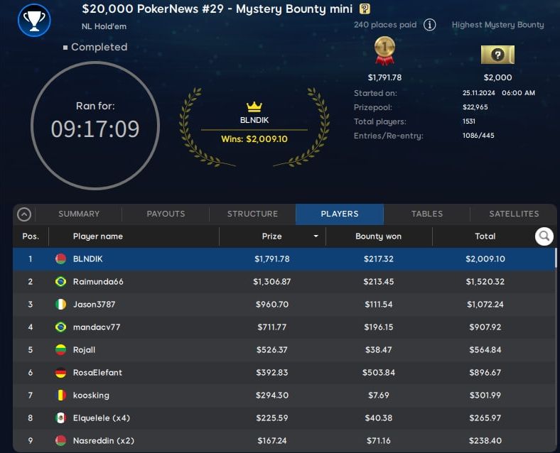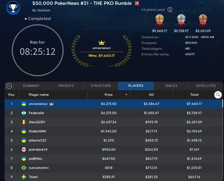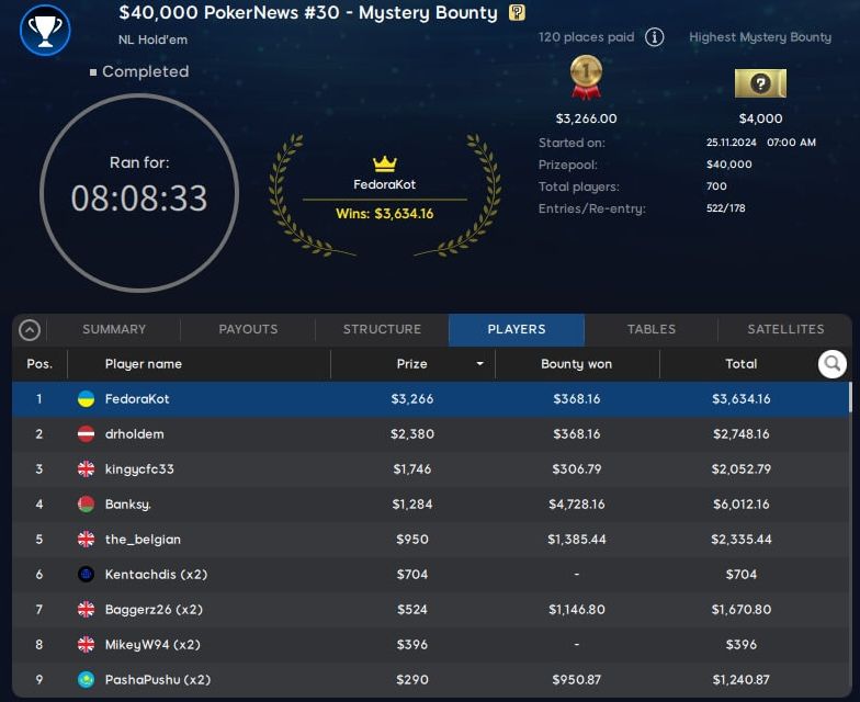 Beim $55 Mystery Bounty (Event #30) war “FedoraKot” nicht zu stoppen, während „universiluci“ das $109 PKO Rumble (Event #31) siegreich beendete.