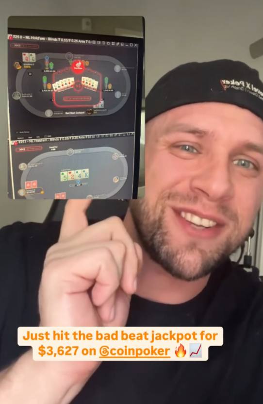 Am 21. November war es Poker Pro und „Level X Poker„-Coach Jack Christensen, der nicht schlecht staunte als seine Pocket Kings von Pocket Queens bezwungen wurden, und das obwohl er mit AAK im Board ein Full House machte. Doch aus zwei Damen seines Gegners wurden vier und so verlor Jack Christensen einen nicht unerheblichen Pot mit Pocket Kings. – Allerdings dauerte der Ärger über das Suckout nur kurz an, denn direkt daraufhin erschien das Bad Beat Jackpot Pop-Up das verkündete, das $7.255 ausgeschüttet werden, von denen Jack Christensen $3.627 erhielt. Auf seinem Instagram-Account @lvlxpoker zeigte er seinen Followern wie es aussieht, wenn man auf CoinPoker den Bad Beat Jackpot knackt: