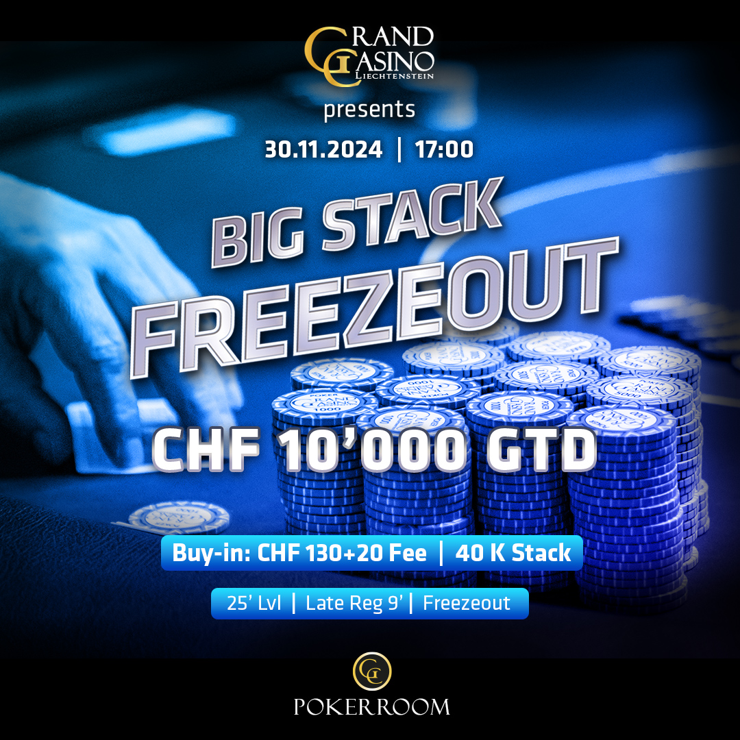 Heute wird im Grand Casino Liechtenstein das CHF 130+20 Bigstack Freezeout gespielt. Es werden 25 Minuten Level gespielt, alle Spieler bekommen einen 40.000 Chipstack zum Start – los geht es um 17:00 Uhr, Registration ist offen bis in Level 9.