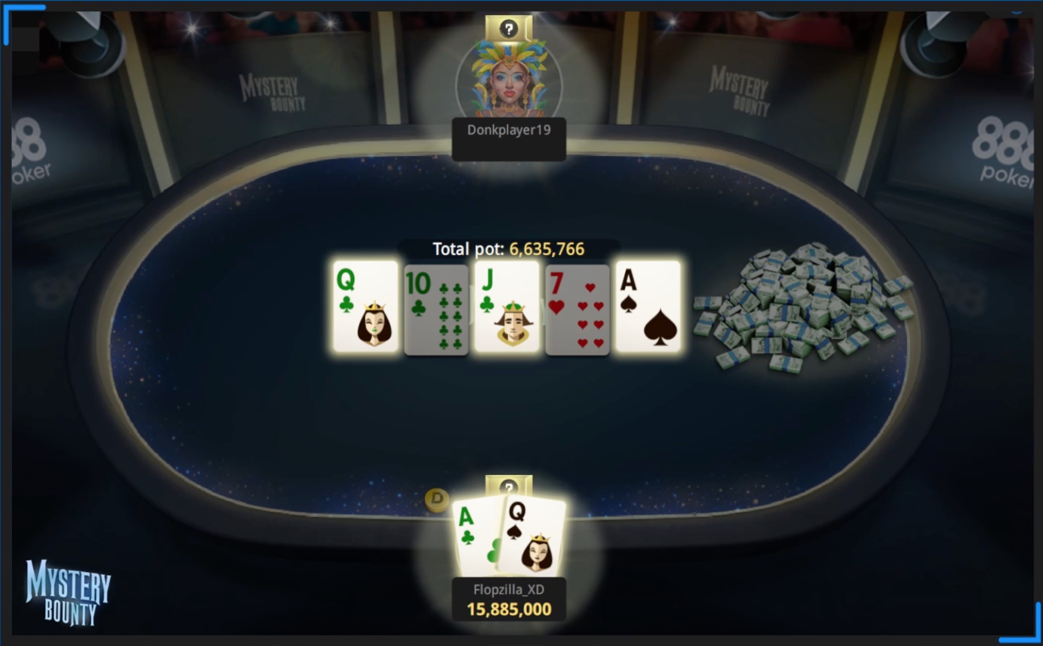 Und so war es nicht ganz überraschend, dass eben genau „Flopzilla_XD“ und „Donkplayer19“ im Heads-Up landeten – und das mit fast absolut identischen Stacks … und das jeder 70 BB deep! Es sollte also ein spannendes und für Online-Verhältnisse durchaus langes Duell um Titel, $8.167 Siegprämie und 2 Bountys werden, eine zu gewinnende und ein zu verteidigende.