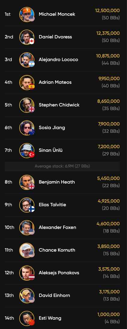 Weiter an der Spitze des Turniers mit 14 left sitzt der US-Amerikaner Michael „Texas Mike“ Moncek, der inzwischen 12,5 Mio. Chips vorweisen kann. Er wird dicht gefolgt von Daniel Dvoress aus Kanada mit 12,38 Mio. Chips.