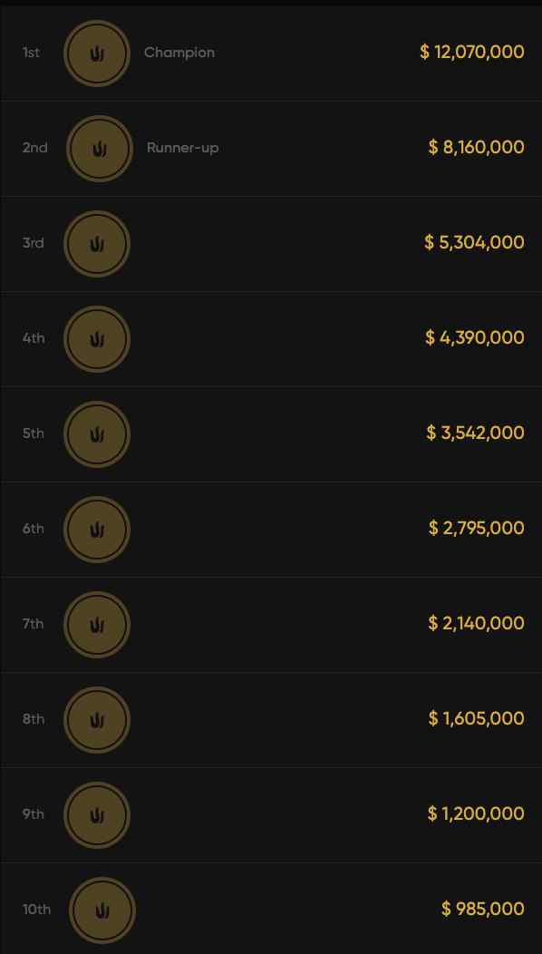 Alle Spieler haben $792.000 sicher, am Final Table warten $1,2 Mio. auf die Spieler – der Sieger geht mit Trophäe und $12.070.000 aus dem Turnier.