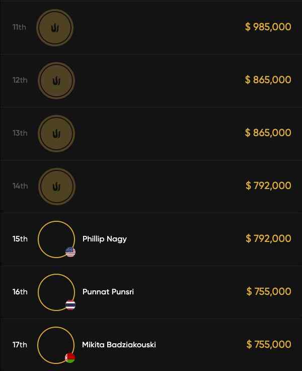 Auch Paul Phua (Platz 22), Artur Martirosian (Platz 19) und Ryan Feldman (Platz 18) mussten vor dem Geld aus dem Turnier. Mikita Badziakouski (Platz 17, $755.000) und Philipp Nagy (Platz 15, $792.000) cashten immerhin – haben aber keine Chance auf einen großen Hit mehr.