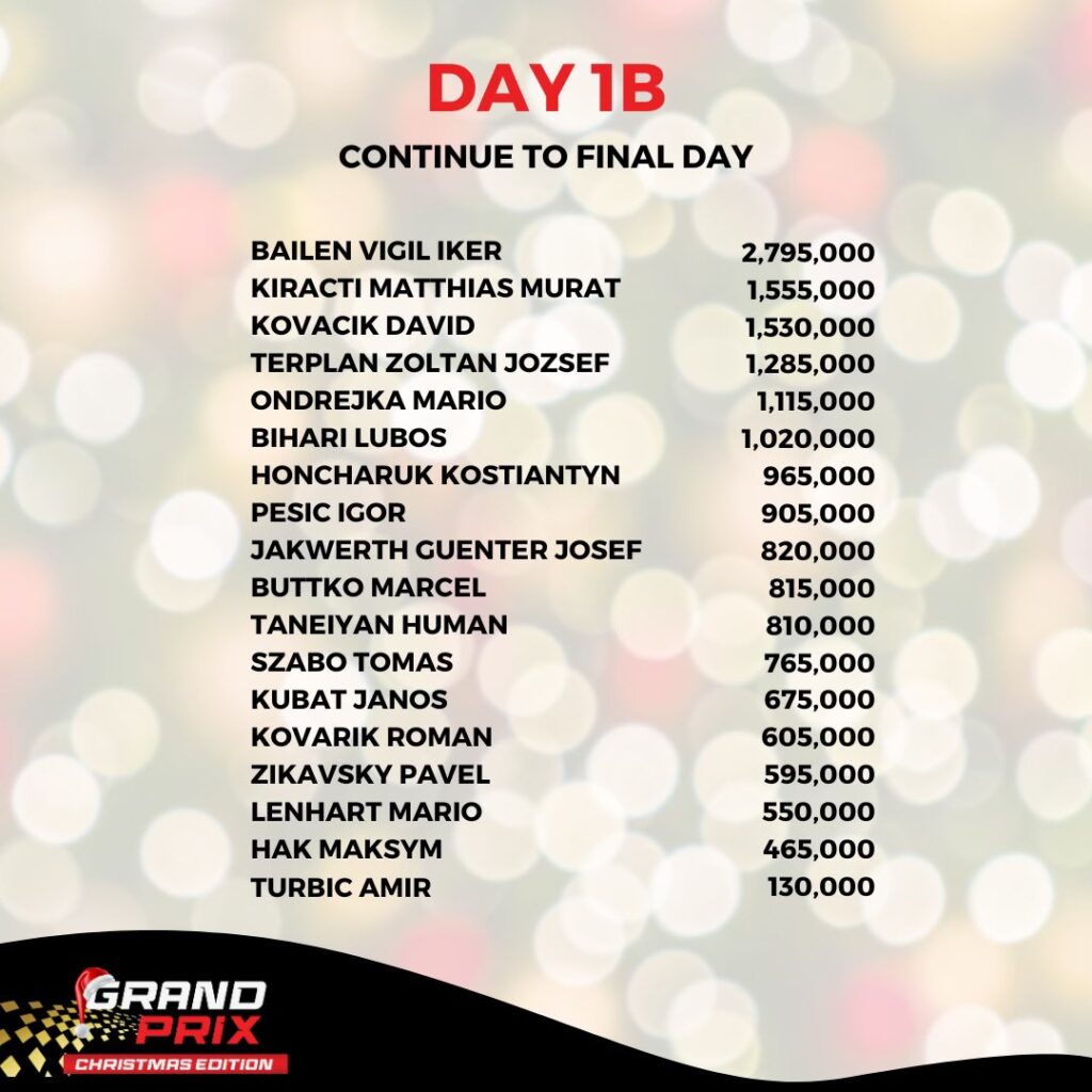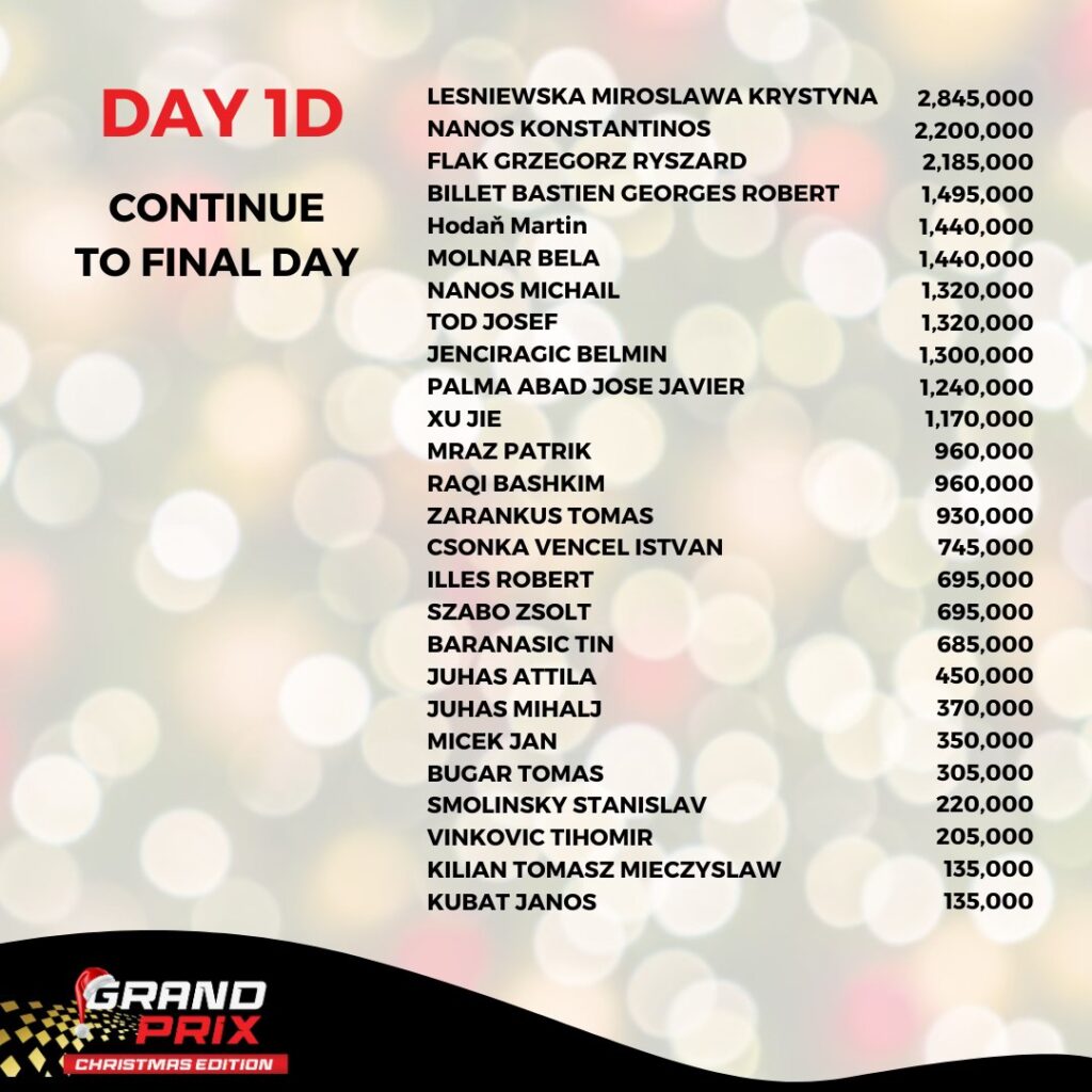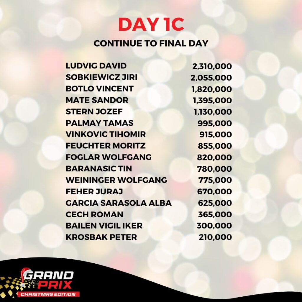 295 Entries gab es für diesen Start-Flight und 30 davon sind durchgekommen in das morgige Finale. Die beste Ausgangsposition hat Roman Pekar mit 1.985.000, dicht gefolgt von Fabian Donovan mit 1.975.000 Chips.