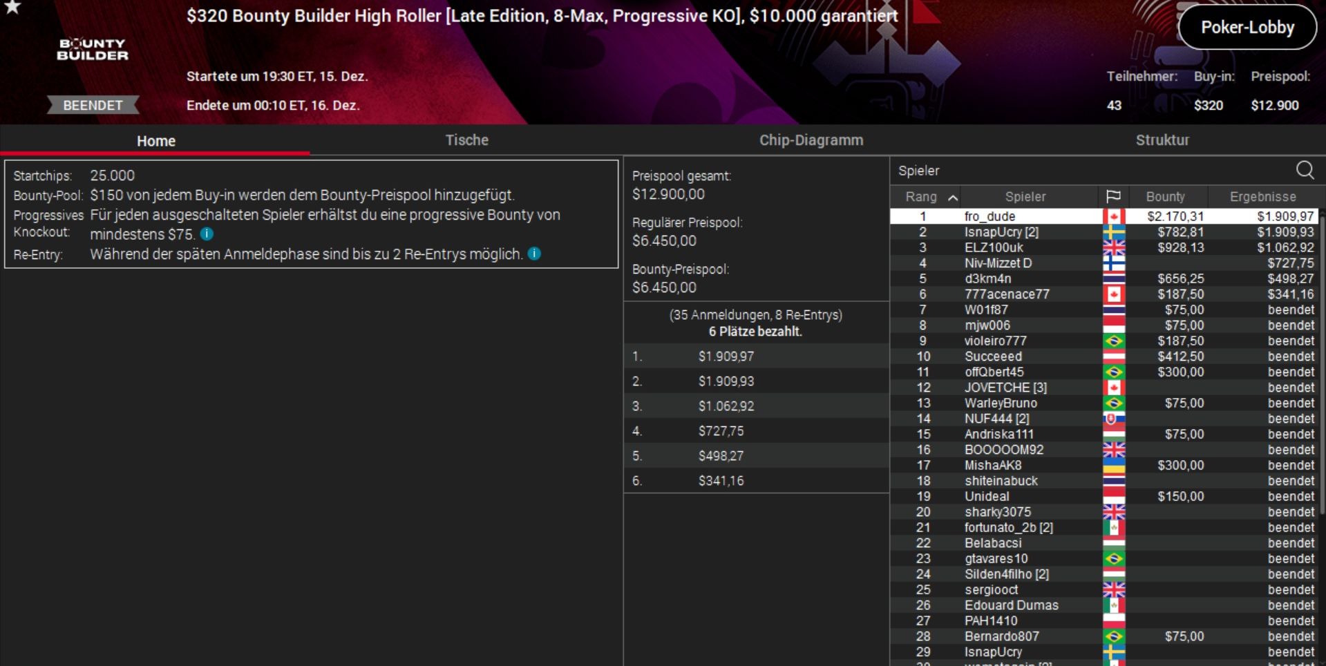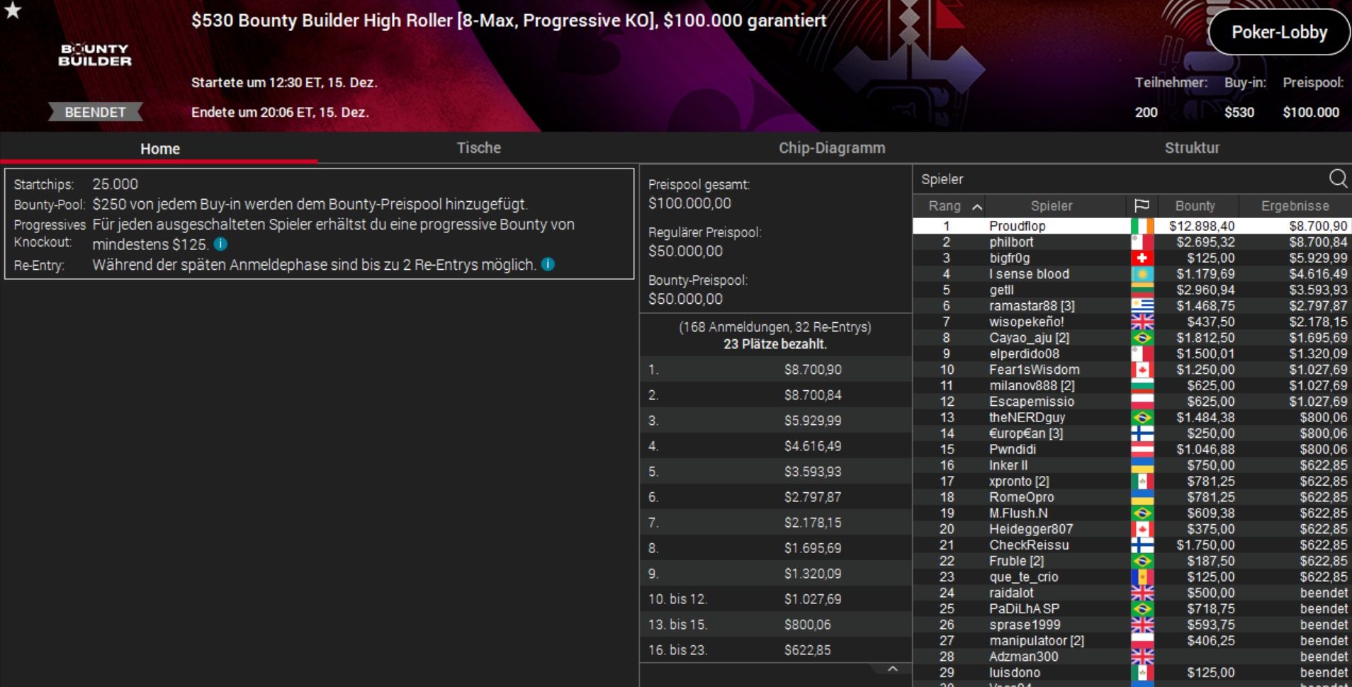 Das beste Ergebnis aus deutschsprachiger Sicht erzielte ein alter Bekannter. Phillip „philbort“ Gruissem schaffte es beim $530 Bounty Builder bis ins Heads-Up, wo er dann dem Briten Jonathan „proudflop“ Proudfoot unterlag.