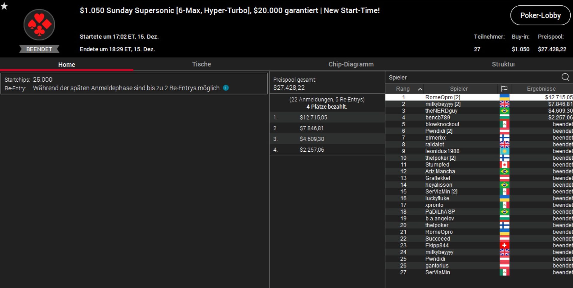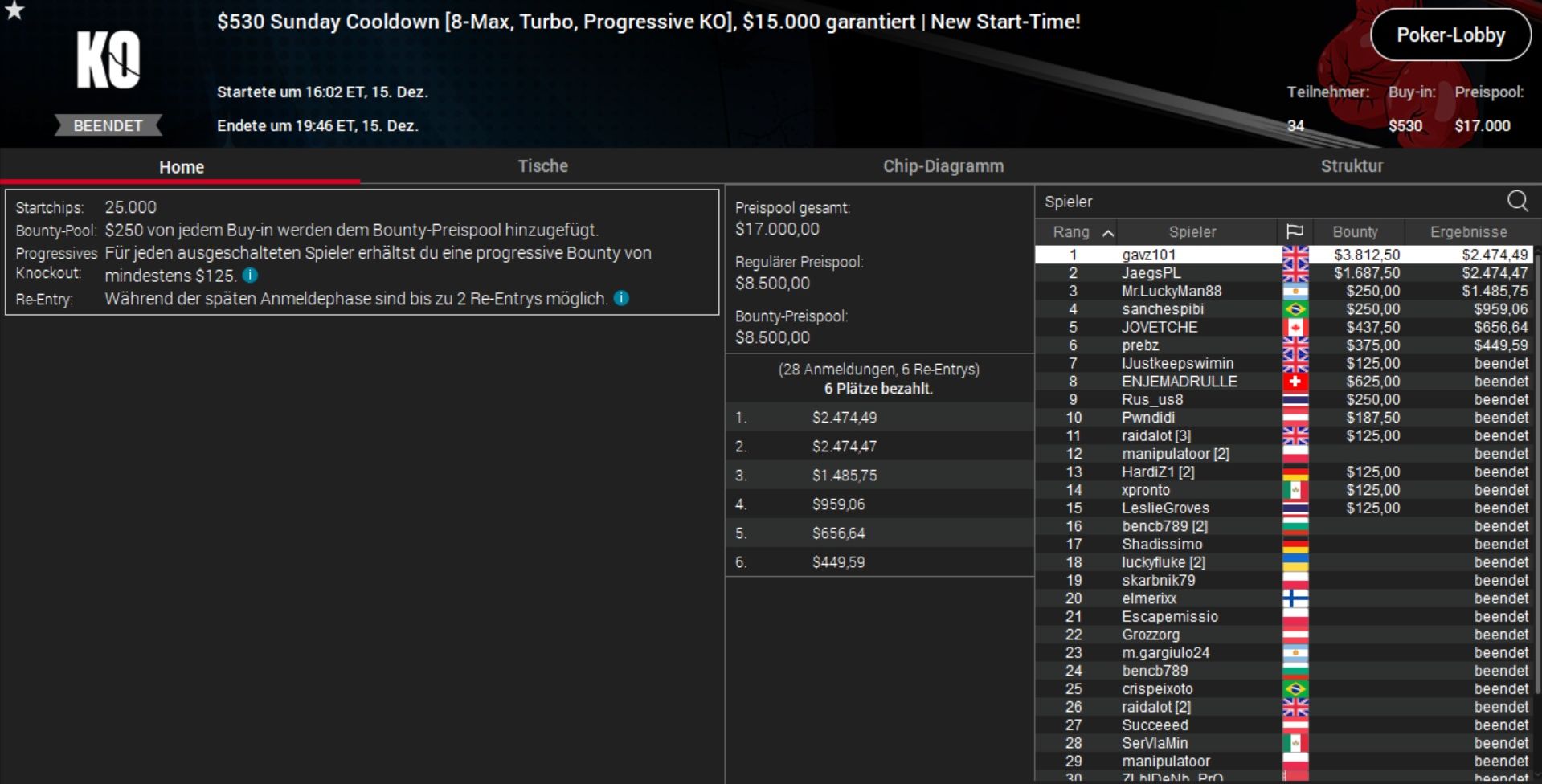 117 Spieler schafften den Sprung ins heutige Finale. Bester DACH-Spieler und damit aussichtsreichster Kandidat auf die Siegprämie von gut $53.000 ist „Dömitzerjung“ auf Platz 7.