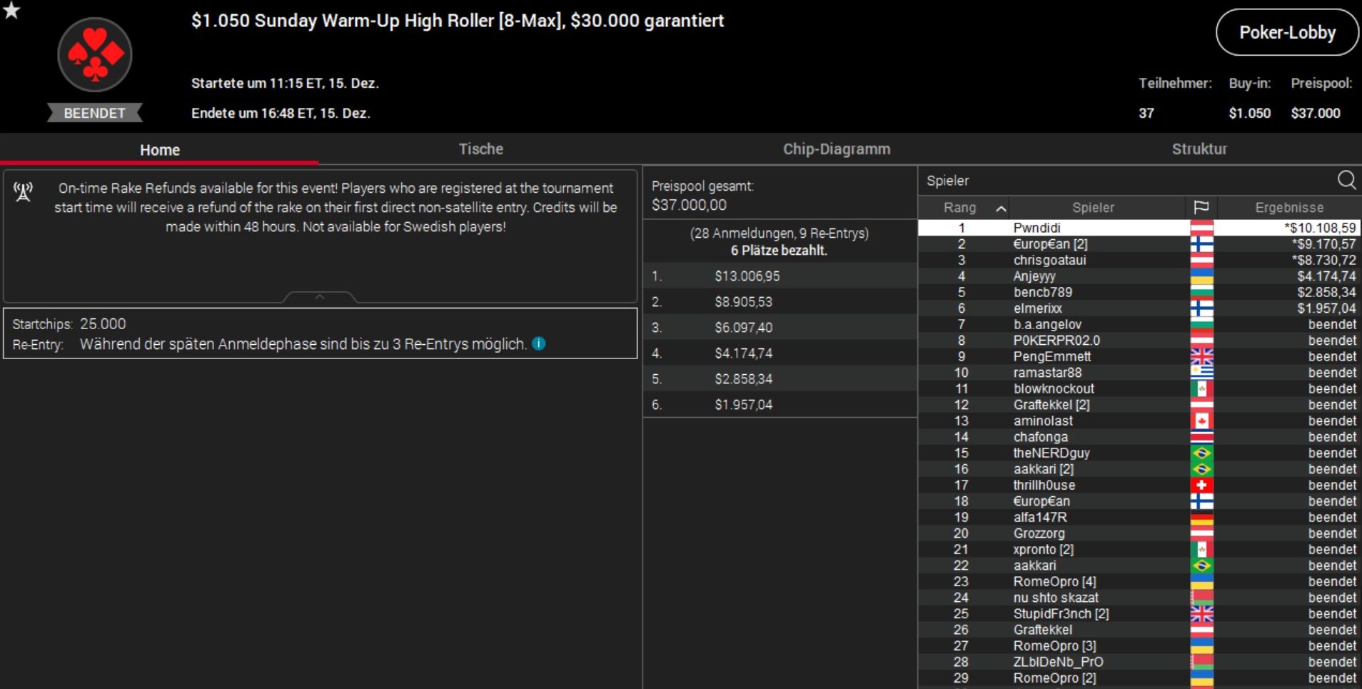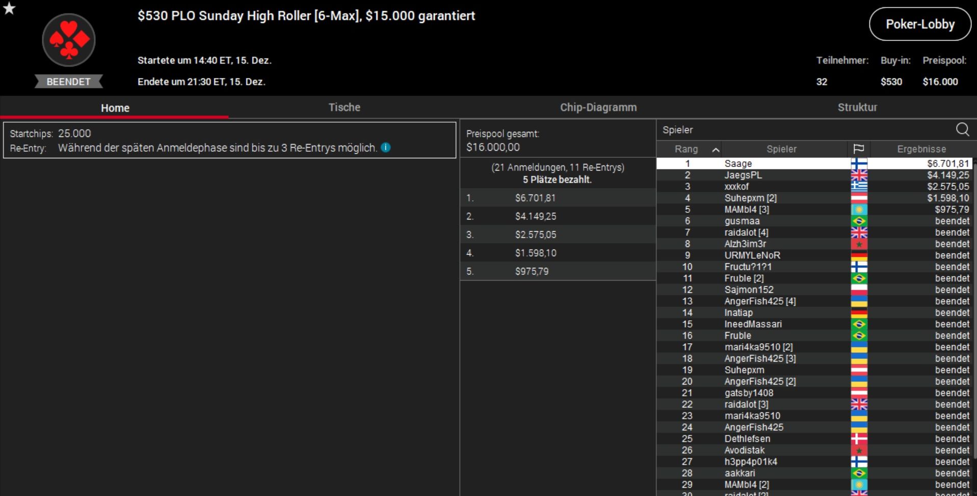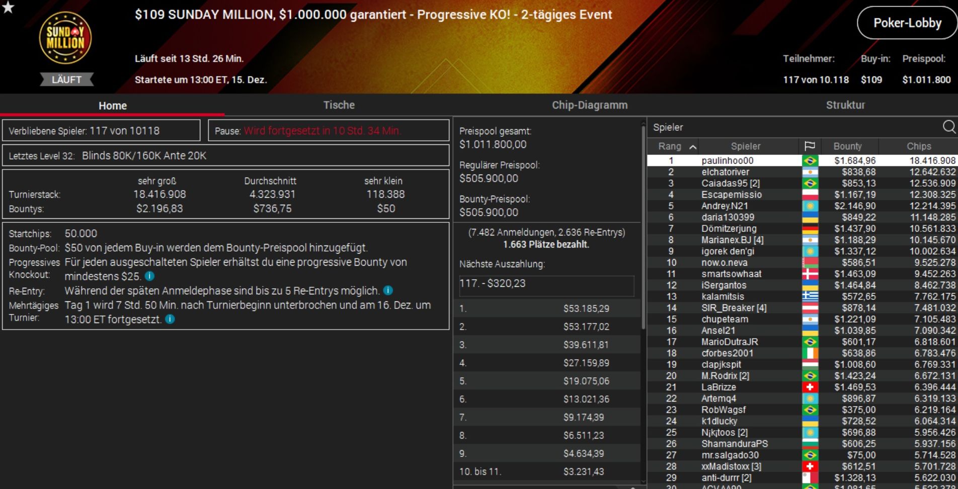 Hier die Ergebnisse und der Zwischenstand bei der Sunday Million: