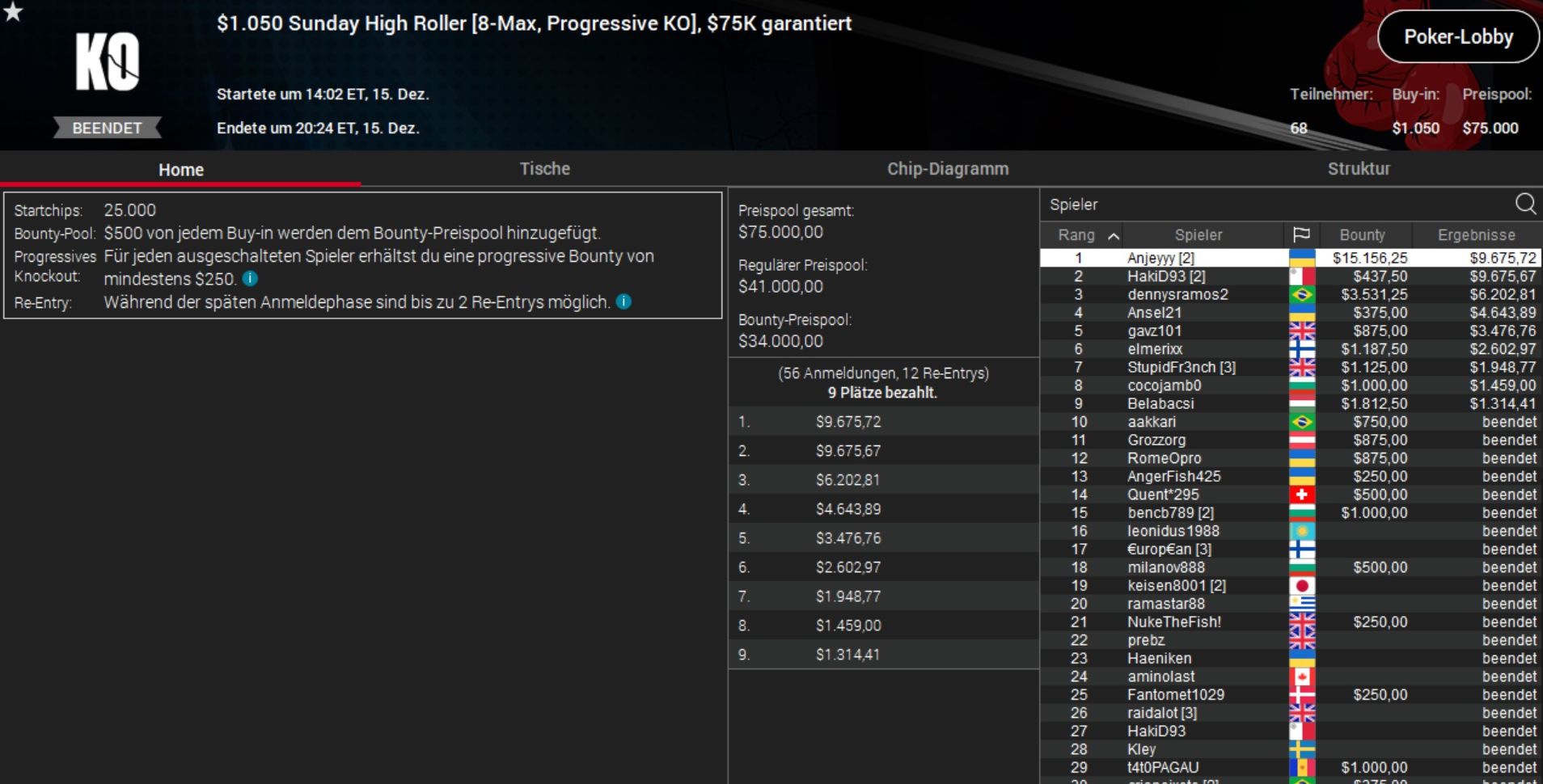 Größter Gewinner des Sonntags war der Ukrainer Andrey „Anjeyyy“ Novak, der sich das $1.050 Sunday High Roller einverleibte und dabei fast $25.000 absahnte.