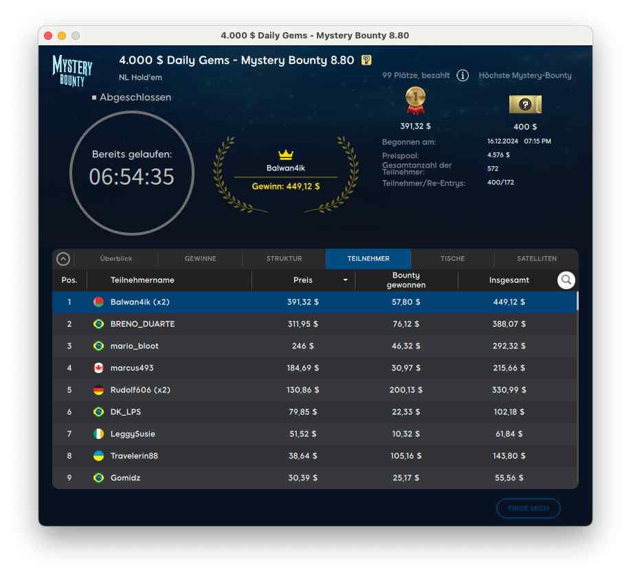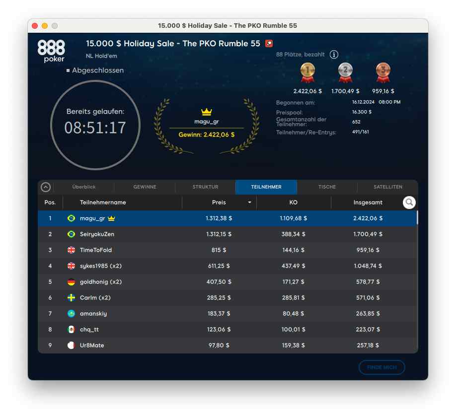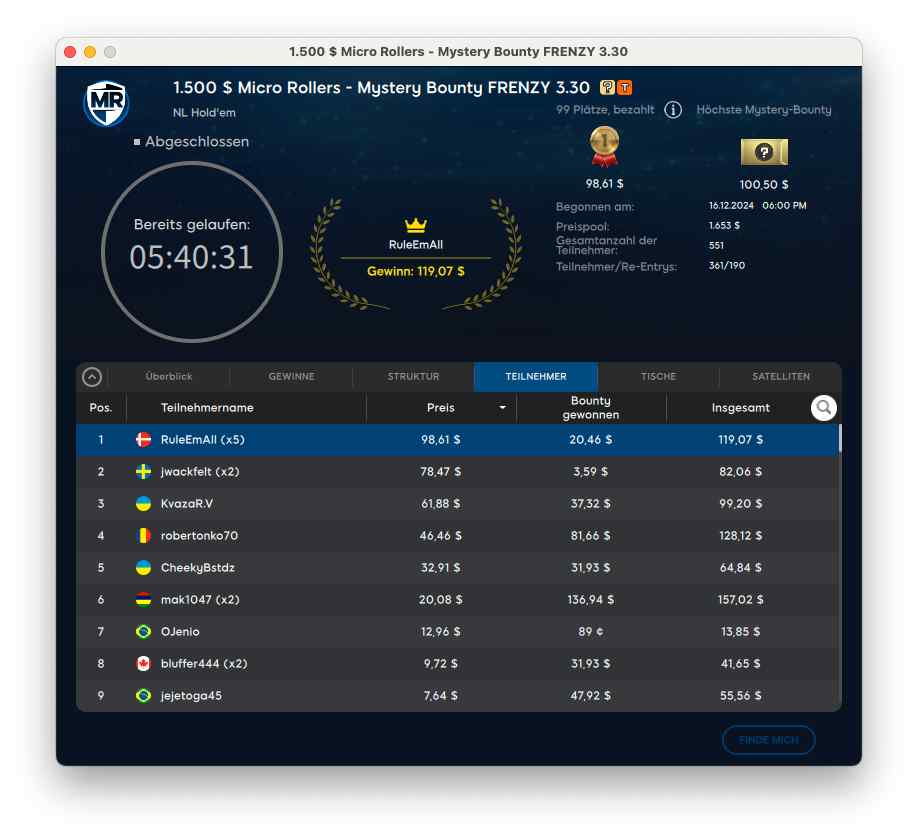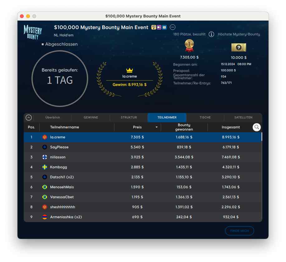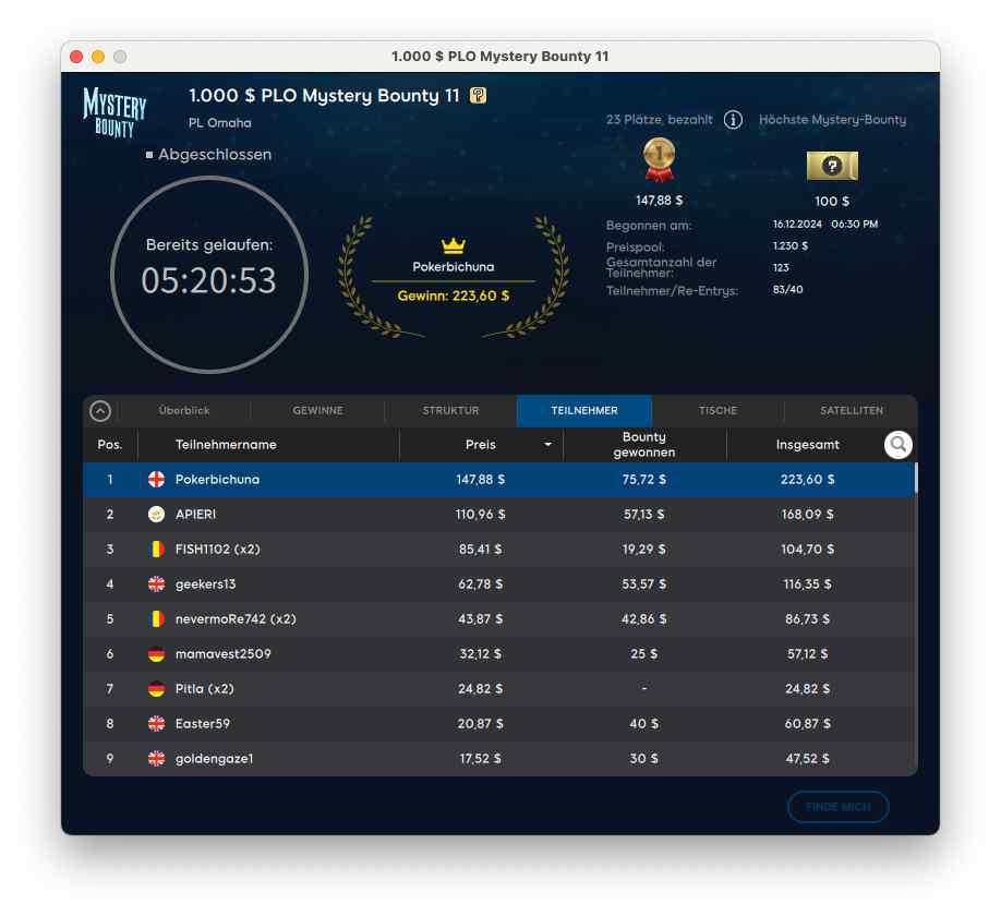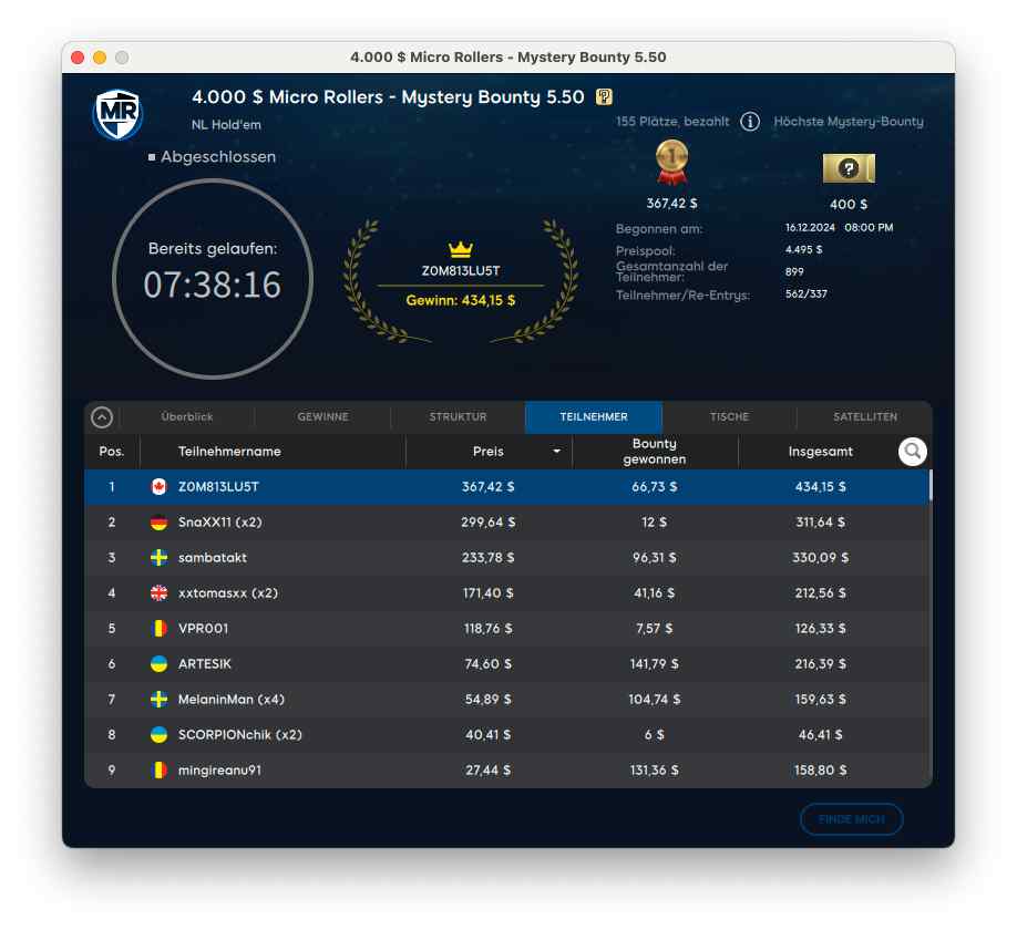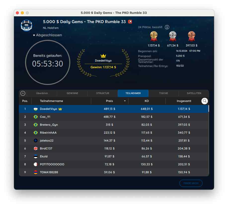 Das größte Bounty ging an „irineu530“ aus Brasilien auf Platz 10 für $535 + $10.331. Der Finne „niilasson“ sammelte auf Platz 3 $3.484 ein, $3.925 gab es für die Platzierung.