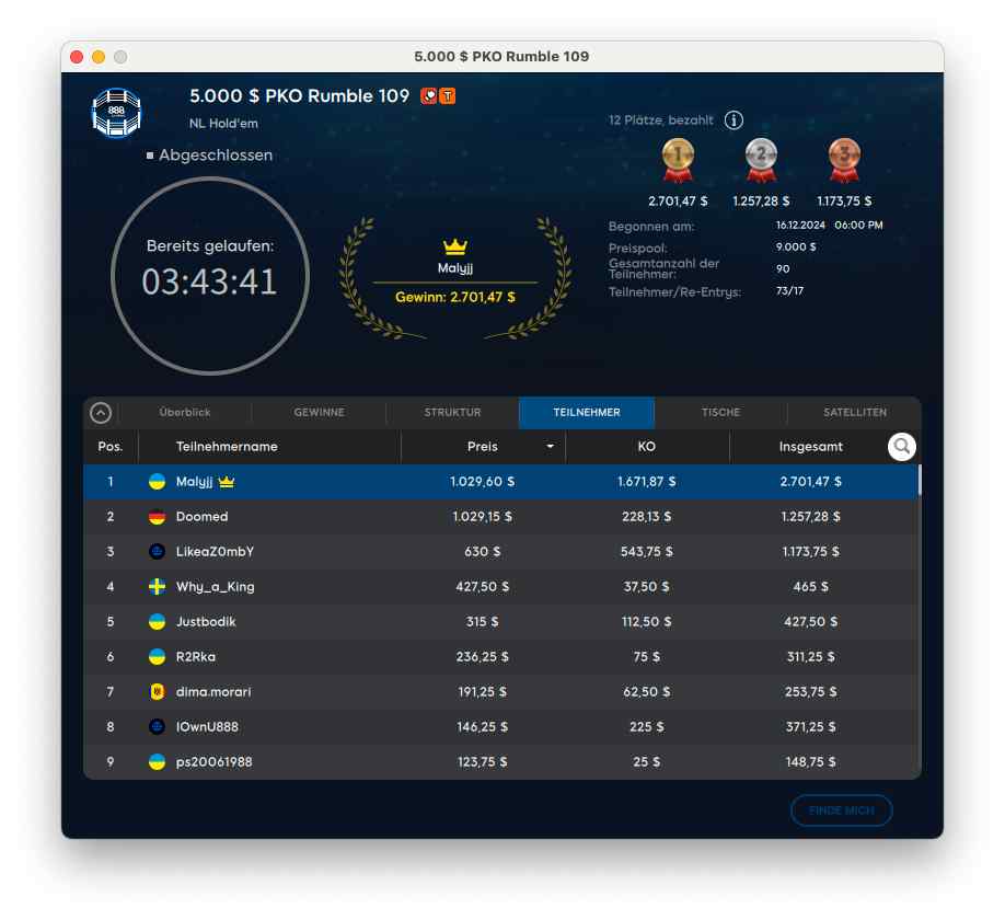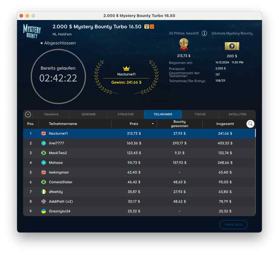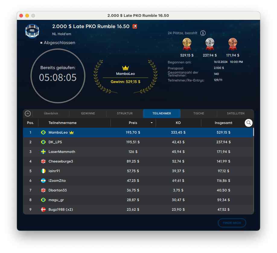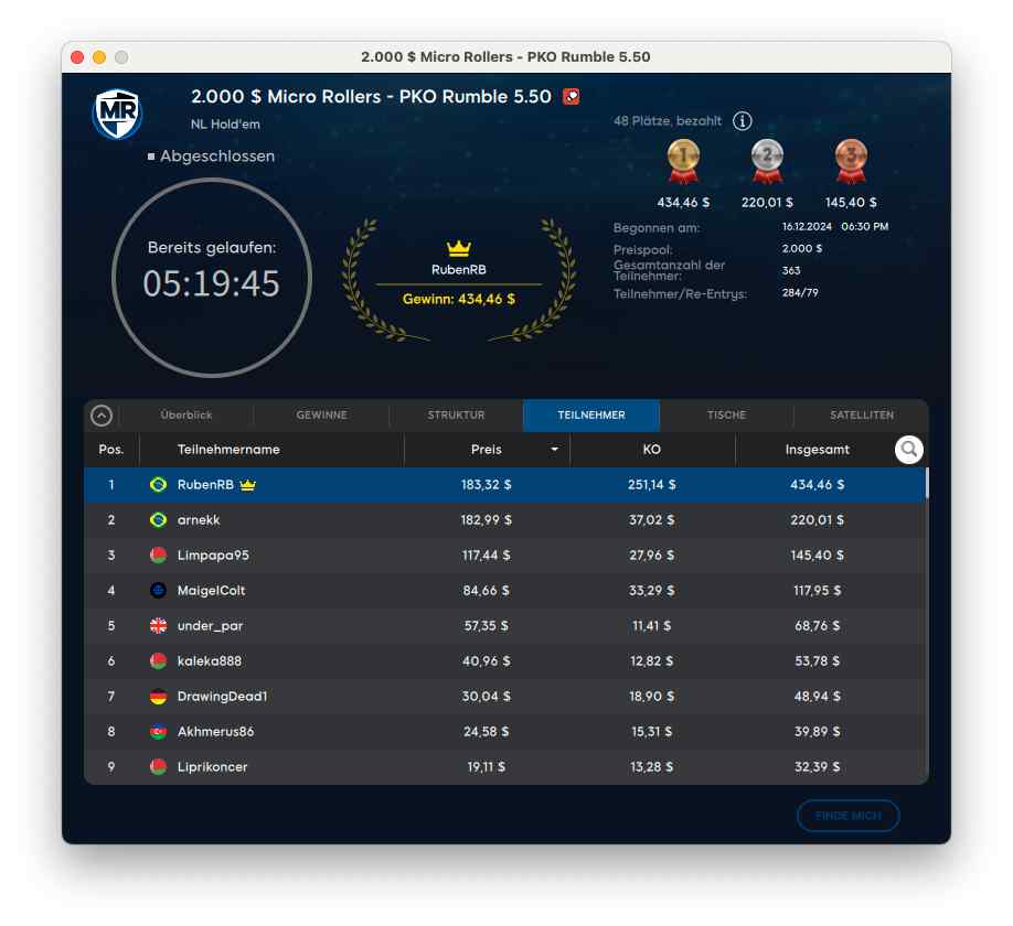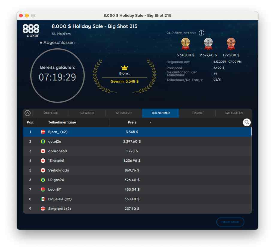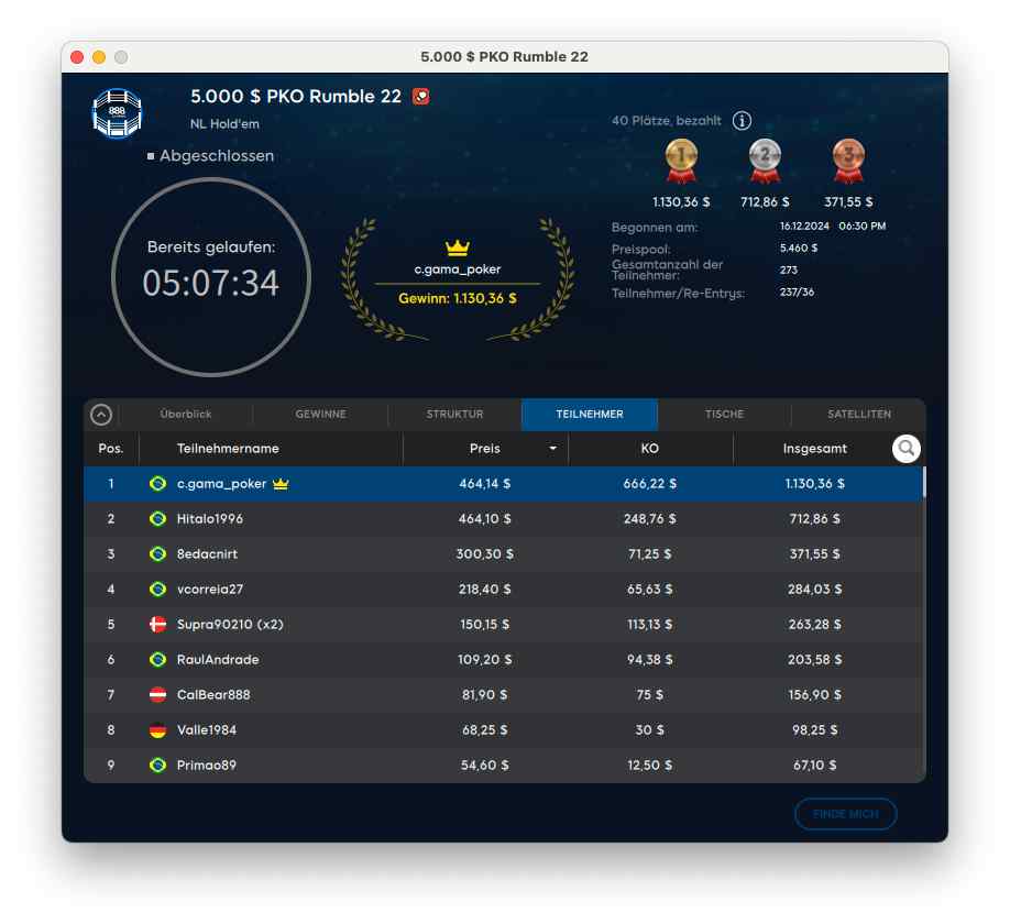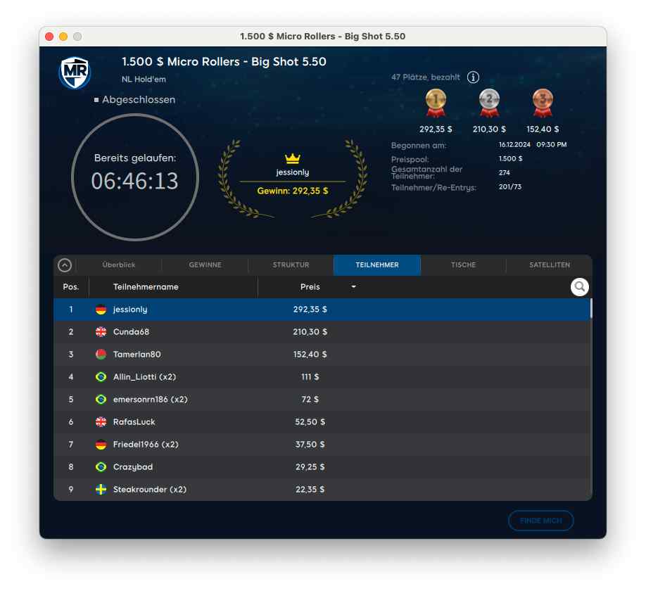 Das größte Bounty ging an „irineu530“ aus Brasilien auf Platz 10 für $535 + $10.331. Der Finne „niilasson“ sammelte auf Platz 3 $3.484 ein, $3.925 gab es für die Platzierung.
