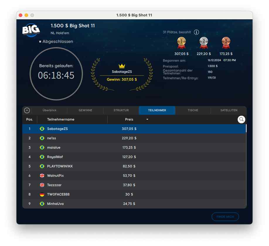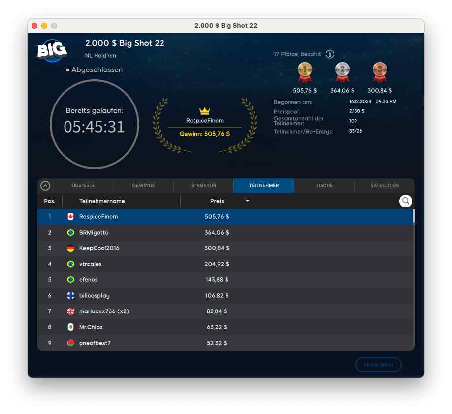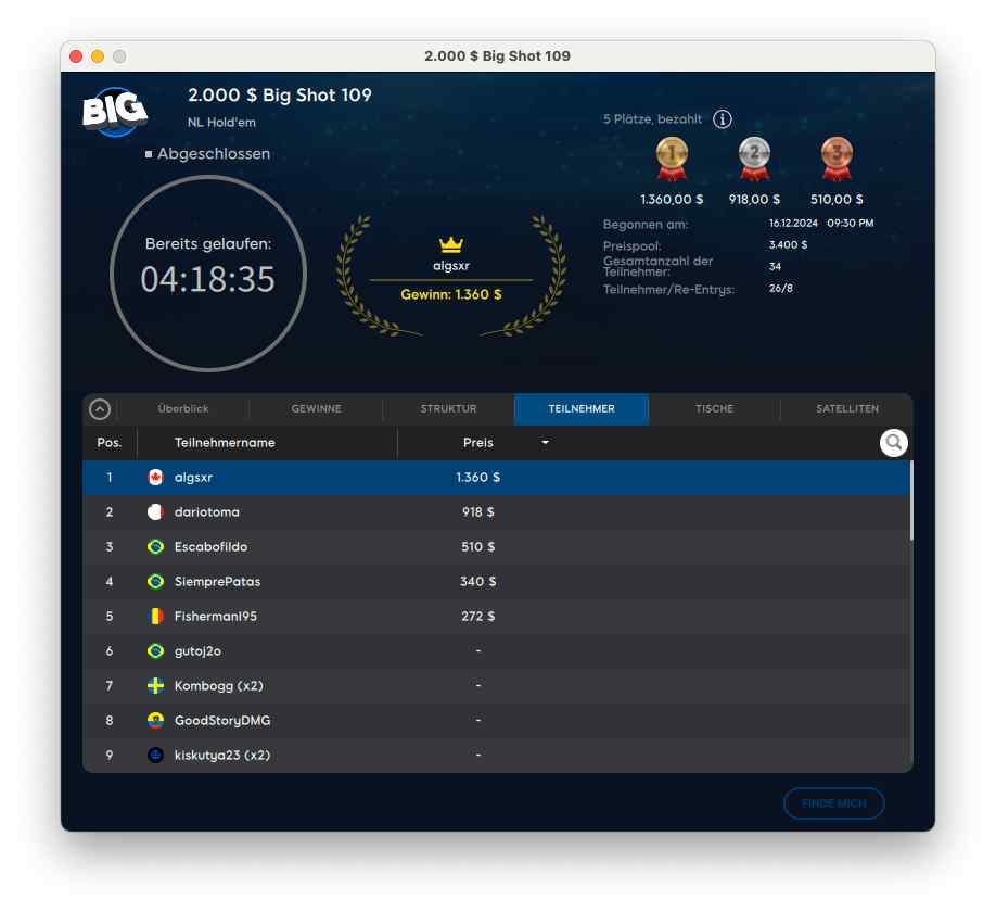 26 Spieler waren beim $109 Big Shot mit dabei, acht Re-Entries wurden gezogen. $3.400 lagen im Preispool, der Kanadier „algsxr“ gewann für $1.360.