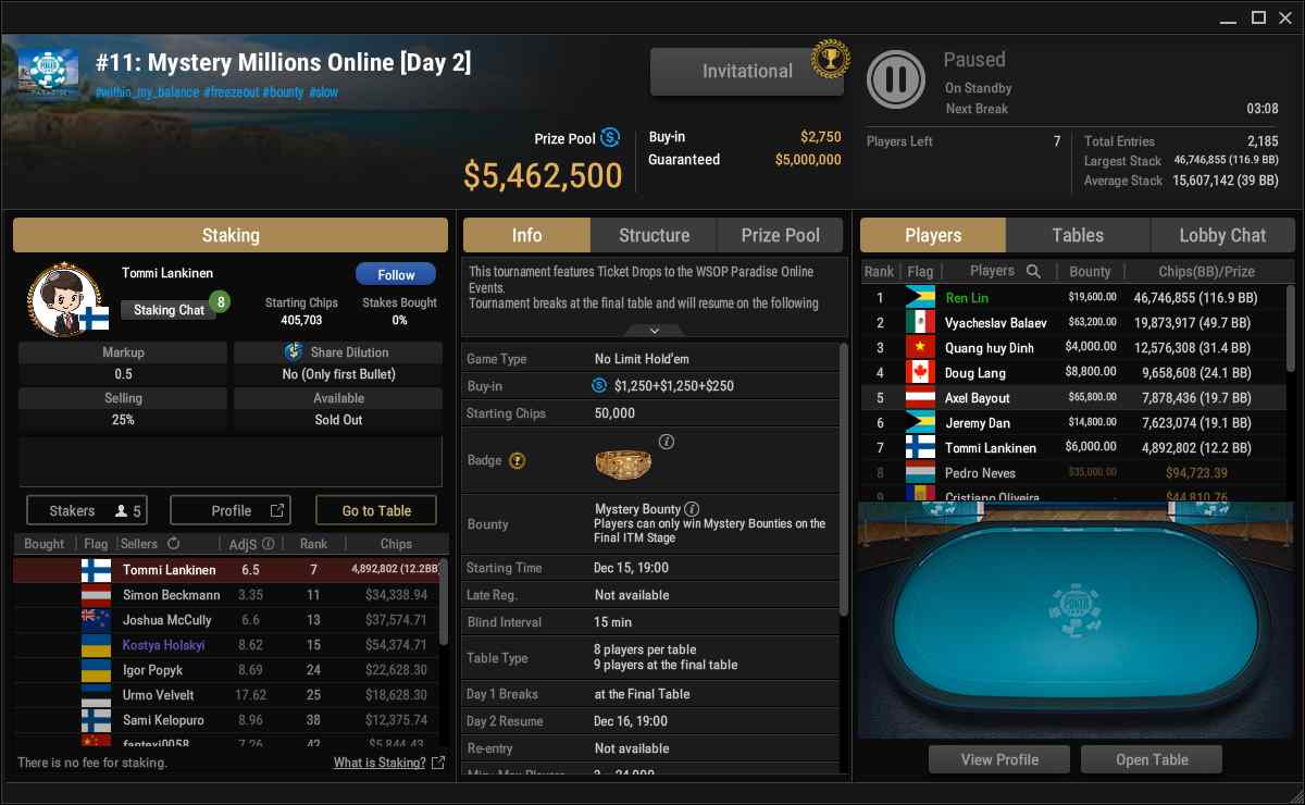 $5,462 Millionen an Preisgeldern und Bountys werden über das Turnier ausgespielt. Die Strukturen des Turniers scheinen unklar, gestern waren neun Spieler eingestiegen, jetzt sind noch sieben im Rennen.