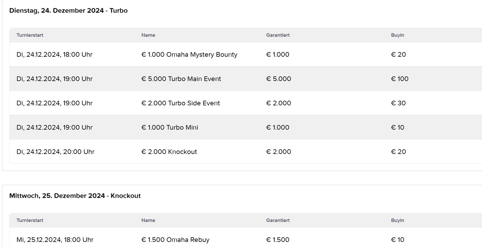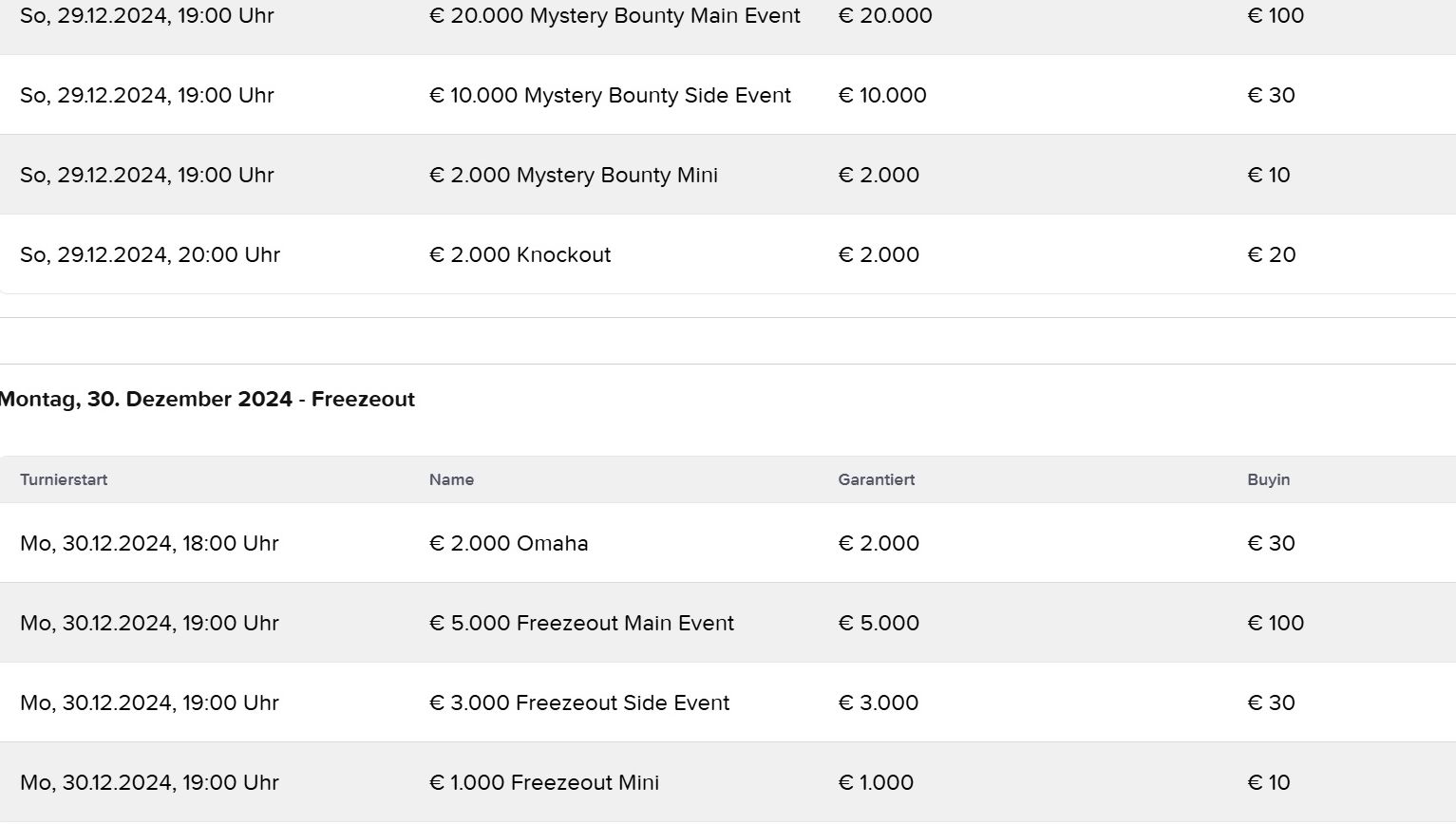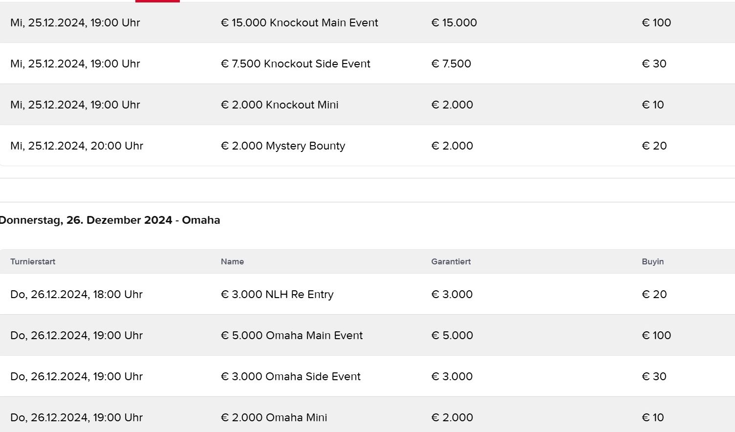 Vom 24. Dezember bis 6. Januar trägt der angeschlossene Pokerroom 70 Turniere mit einem Gesamtpreisgeld von €400.000 aus.