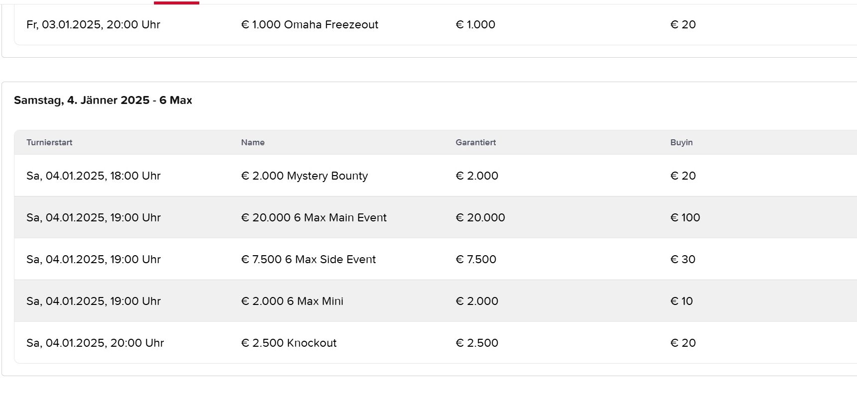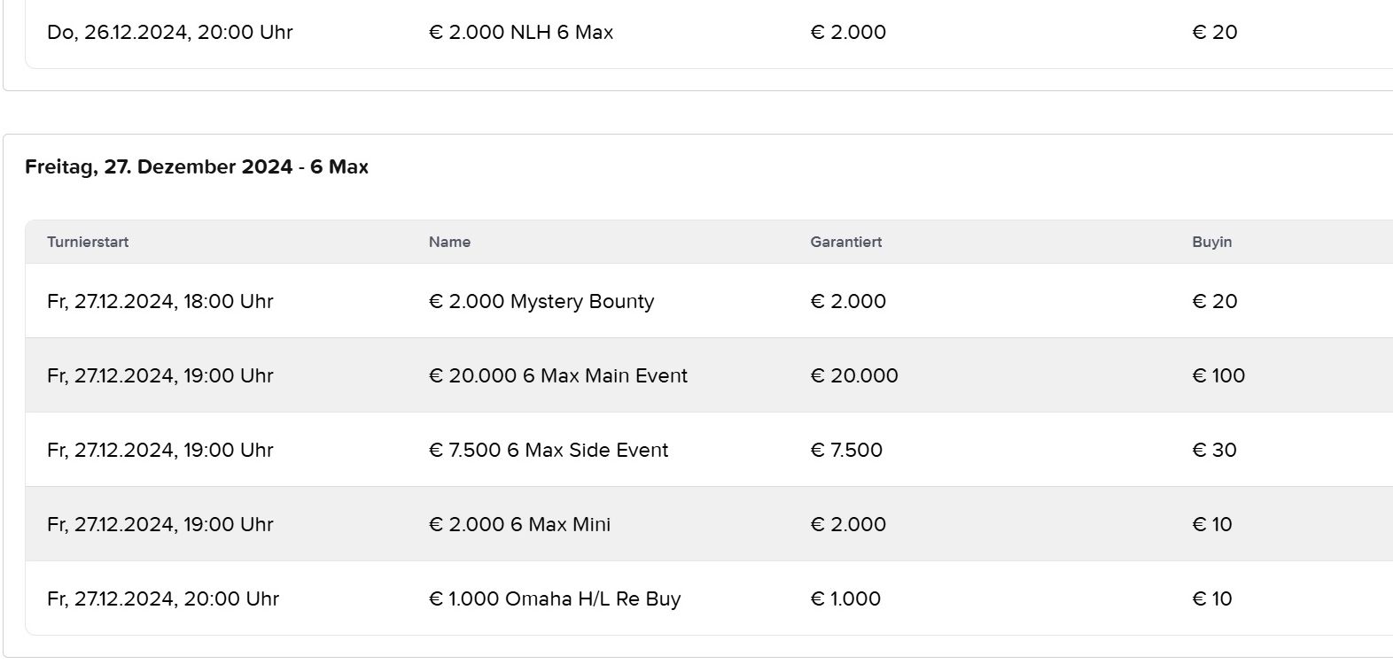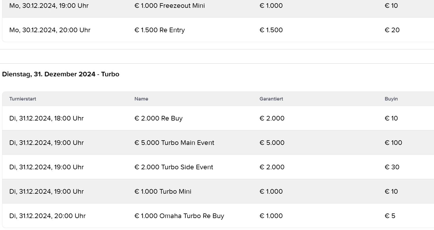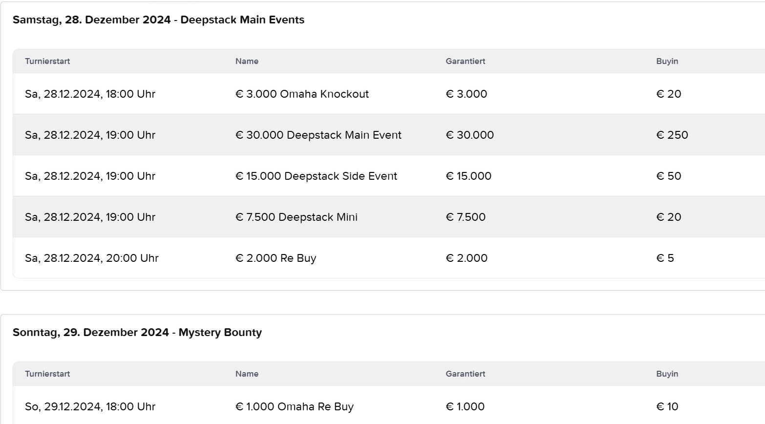 Vom 24. Dezember bis 6. Januar trägt der angeschlossene Pokerroom 70 Turniere mit einem Gesamtpreisgeld von €400.000 aus.