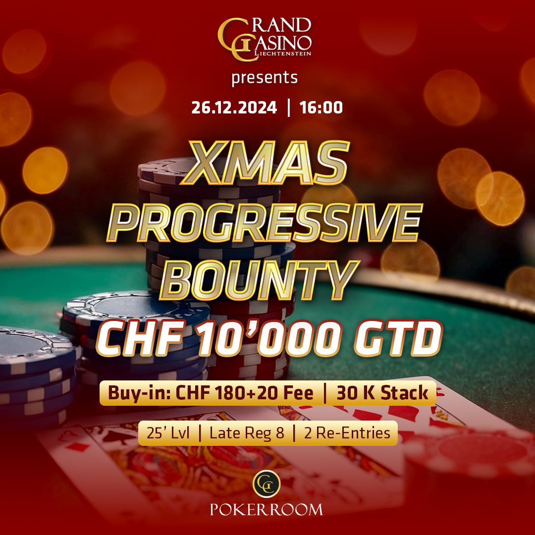 Heute wird im Grand Casino Liechtenstein das CHF 180+20 Xmas Progressive Bounty gespielt. Um 16:00 Uhr kommen die Spieler zum Turnier mit 25 Minuten Level zusammen, 30.000 Chips gibts zum Start. Late-Reg ist bis in Level 8 möglich, zwei Re-Entries können die Spieler tätigen.