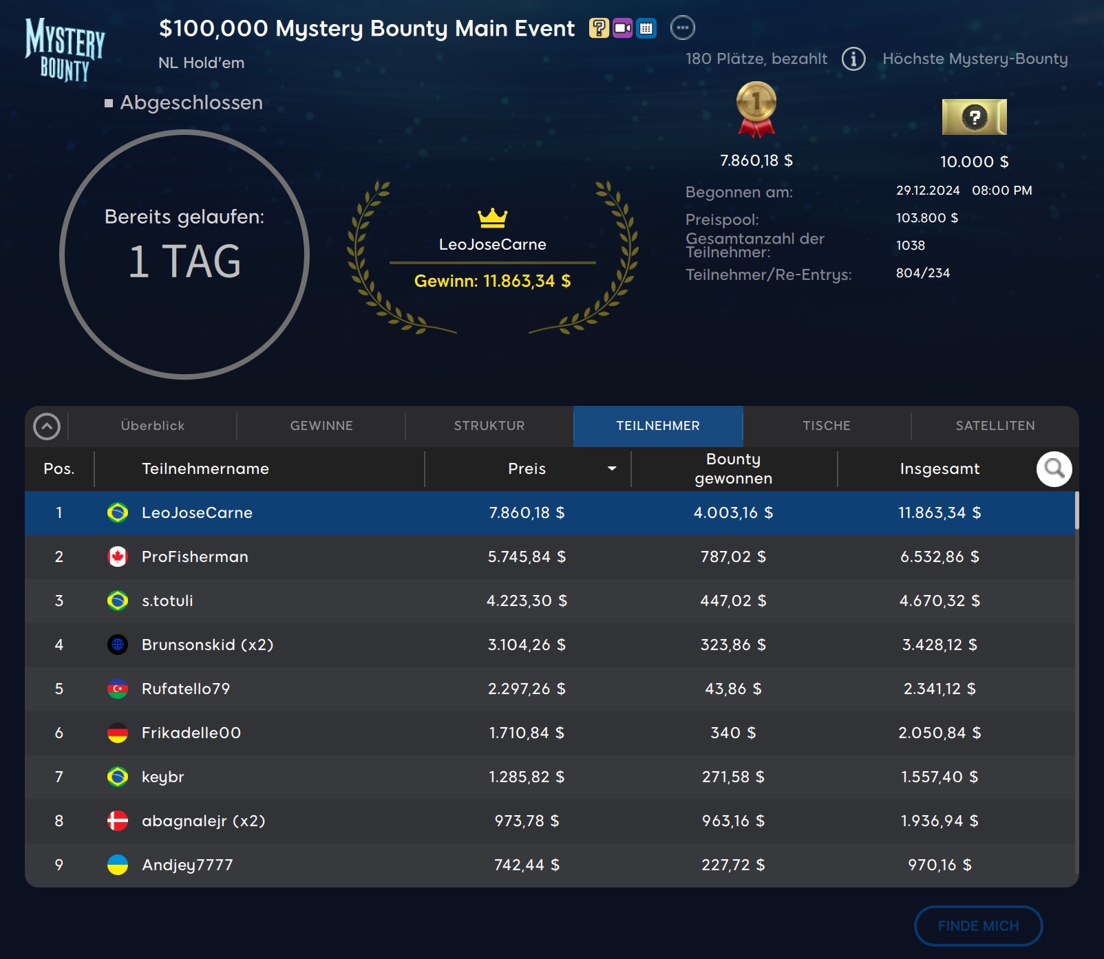 Damit sollte es ein brasilianisch-kanadisches Heads-Up geben, dass Leocir „LeoJoseCarne“ Carneiro mit einem AK>AQ Setup für sich entscheiden sollte. $11.863 sollte der Brasilianer am Ende cashen, wozu mit $3.000 auch die zweithöchste Mystery Bounty gehören sollte. Für den kandischen Angelsportler „ProFisherman“ blieben als Runner-Up kombinierte $6.532.