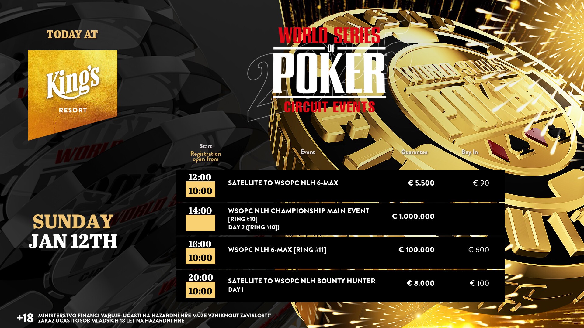 Heute werden im King’s Resort neben Tag 2 des WSOPC Main Event weitere Turniere angeboten. Los geht es um 12 Uhr mit einem €90 Satellite für das €600 NLH 6-max (Ring-Event #11), bei dem zehn Tickets garantiert werden. Um 16 Uhr wird dann Tag 1 dieses Turniers gestartet. Zum Abschluss des Tages findet dann noch um 20 Uhr ein €100 Satellite für den WSOPC Bounty Hunter statt. Hier werden ebenfalls mindestens zehn Tickets ausgespielt.