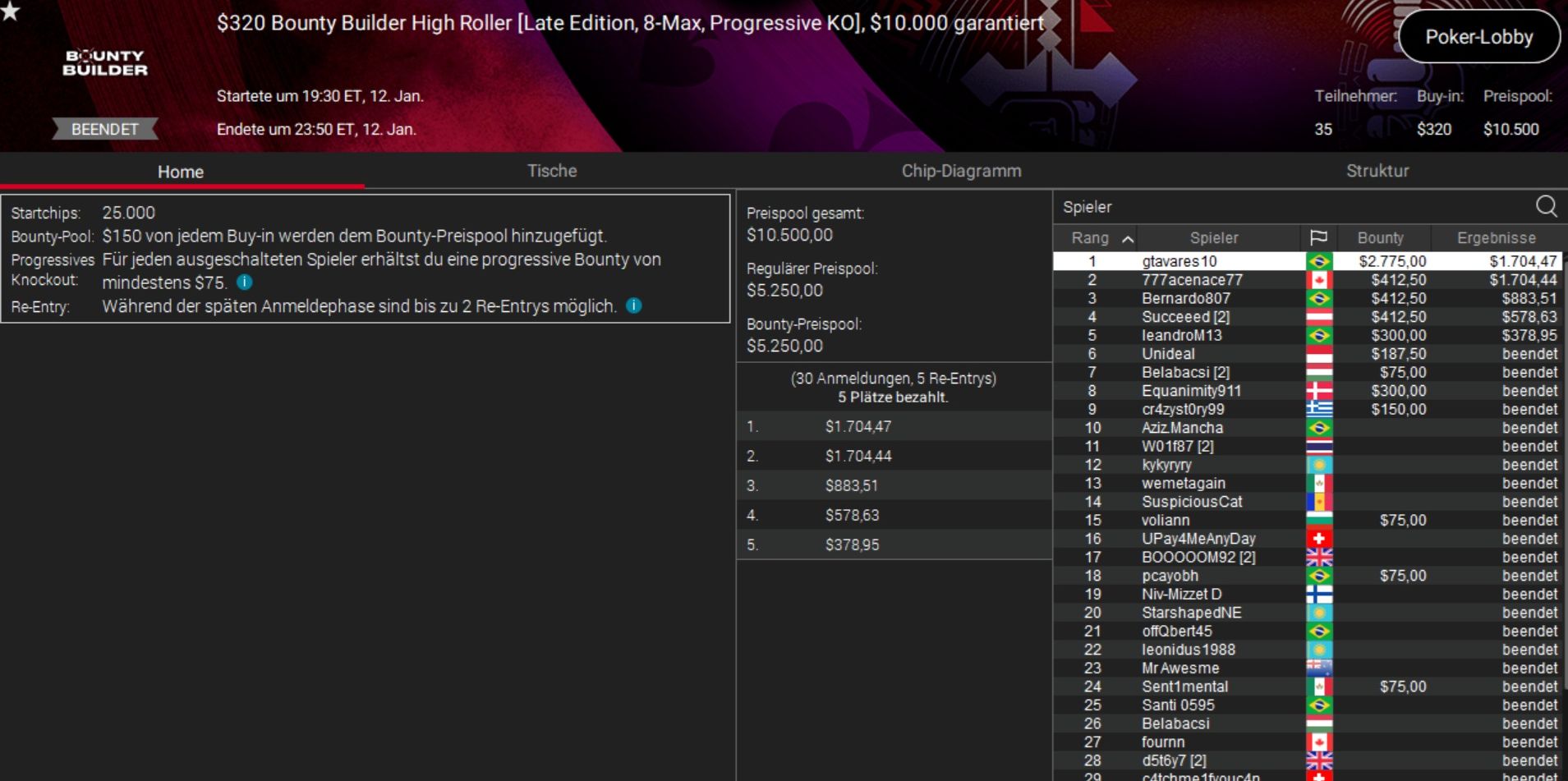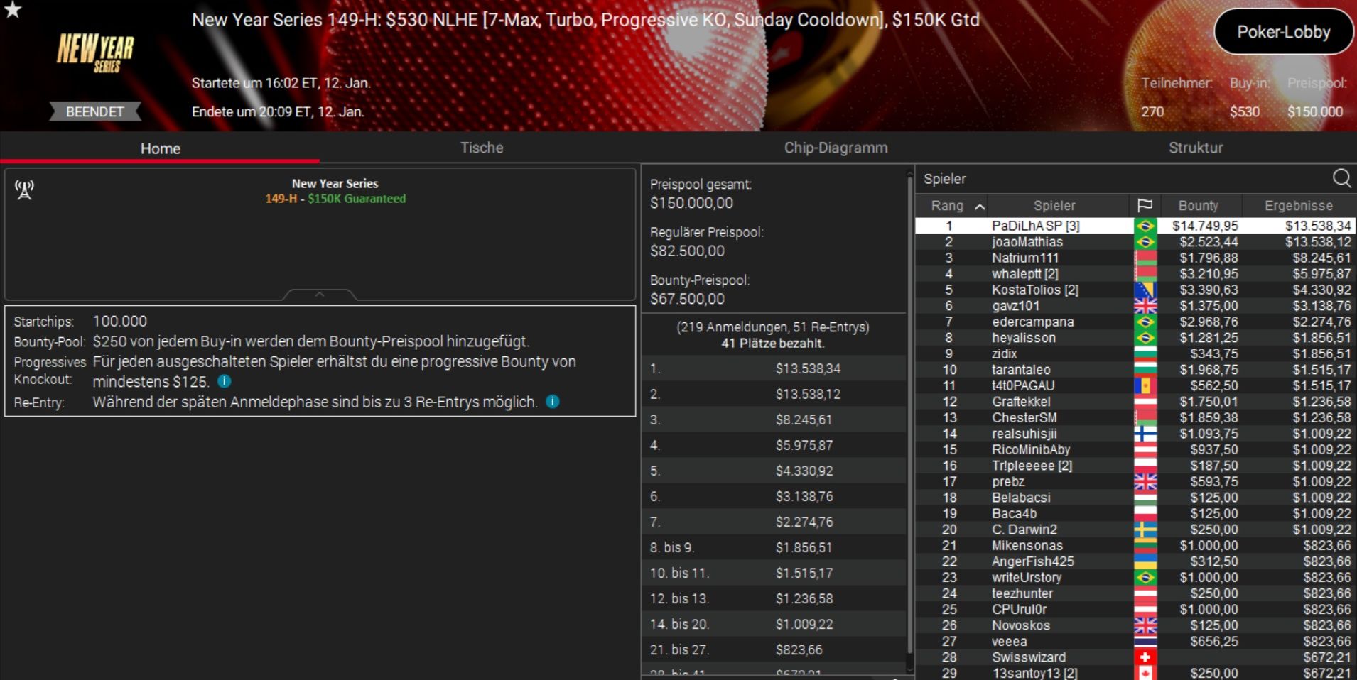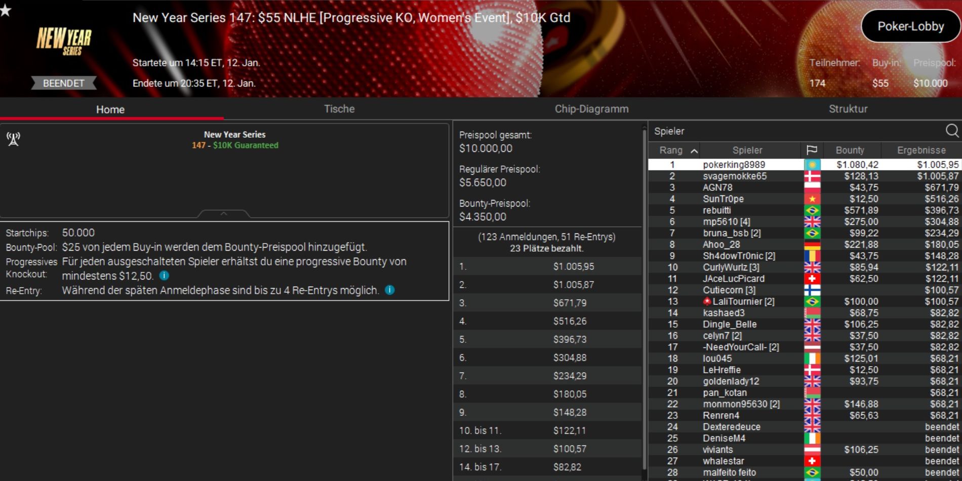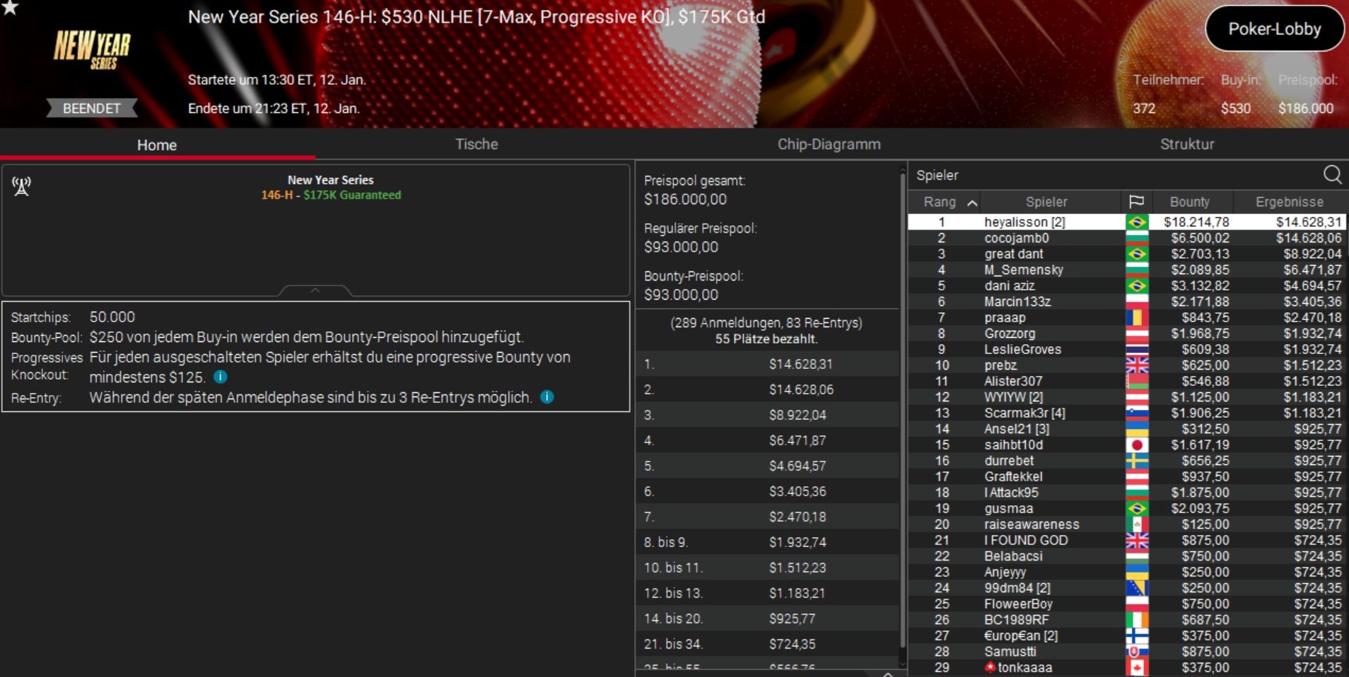 Weitere Top-Platzierungen holten jeweils als Zweiter „KingofdeFlop“ (NYS 142-H, über $29.000 Preisgeld) und „tomfoxpoker“ (NYS 148-H, ebenfalls über $29.000 Preisgeld).