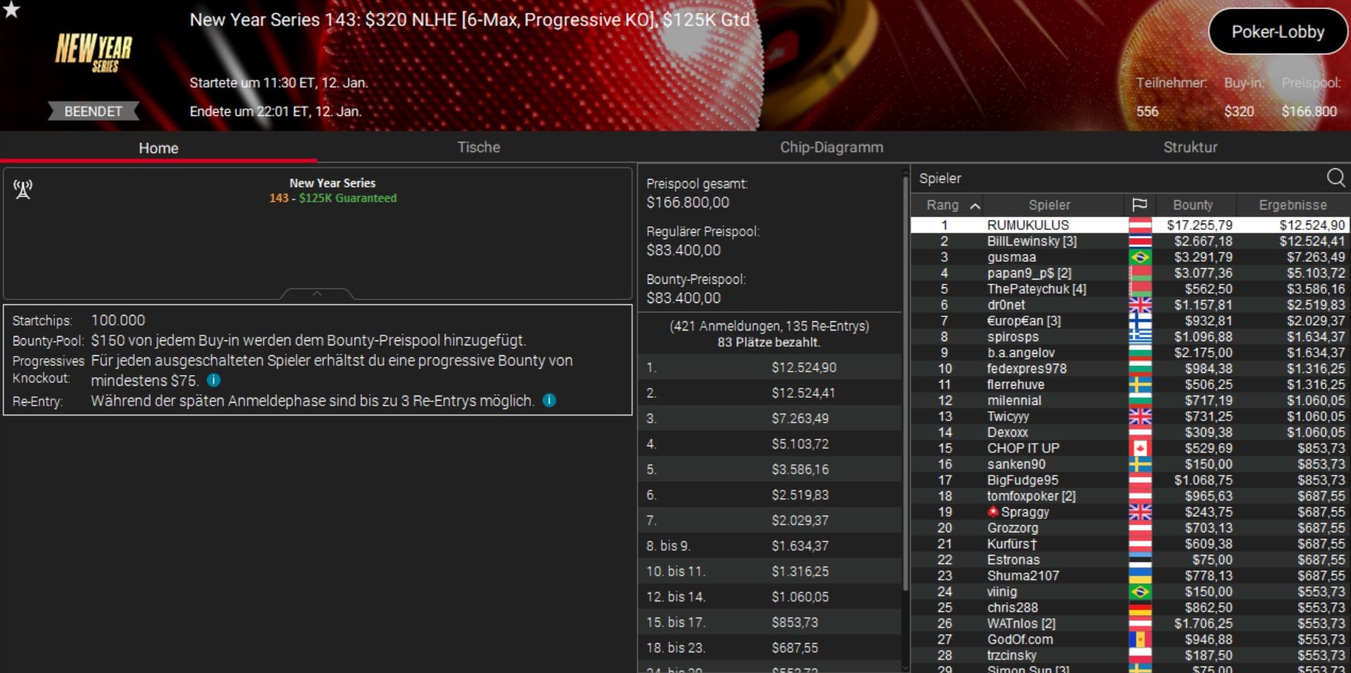 Gleich zwei Siege konnte die DACH-Community dabei am Sonntag einfahren. Leon „RUMUKULUS“ Sturm sicherte sich Event 143, ein $320 NLH PKO, und kassierte rund $30.000 Preisgeld.
