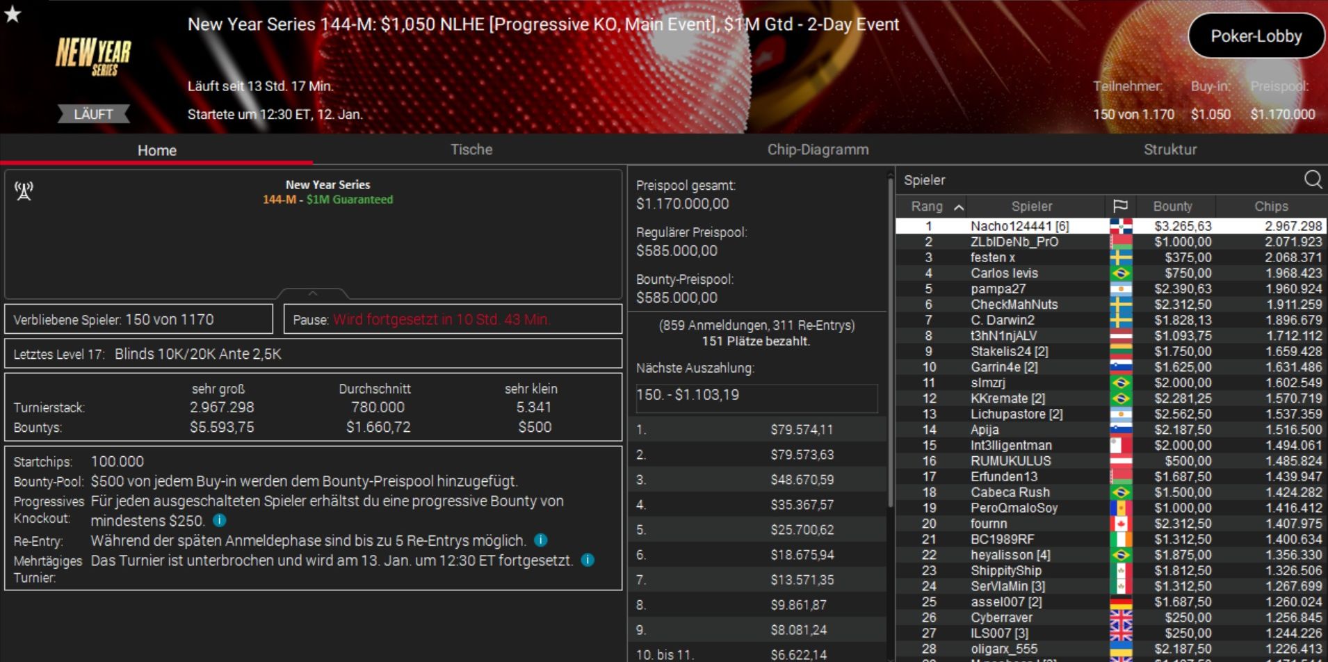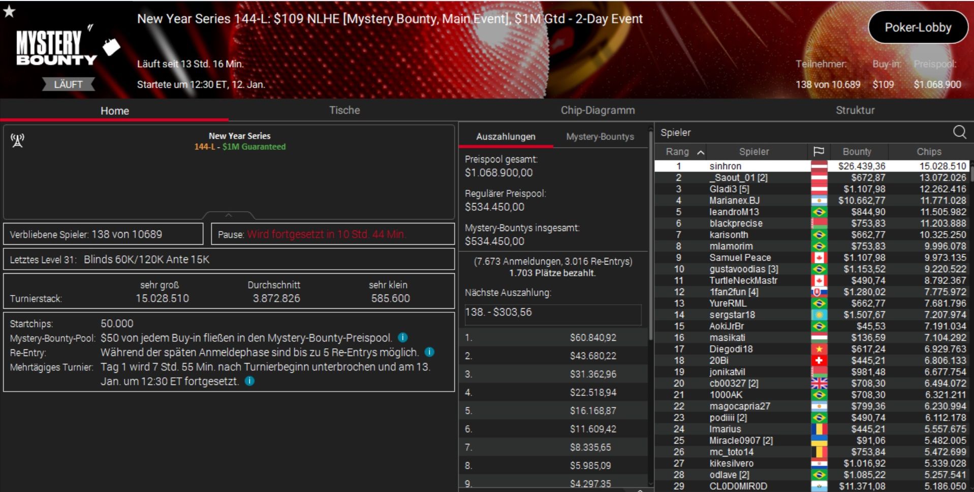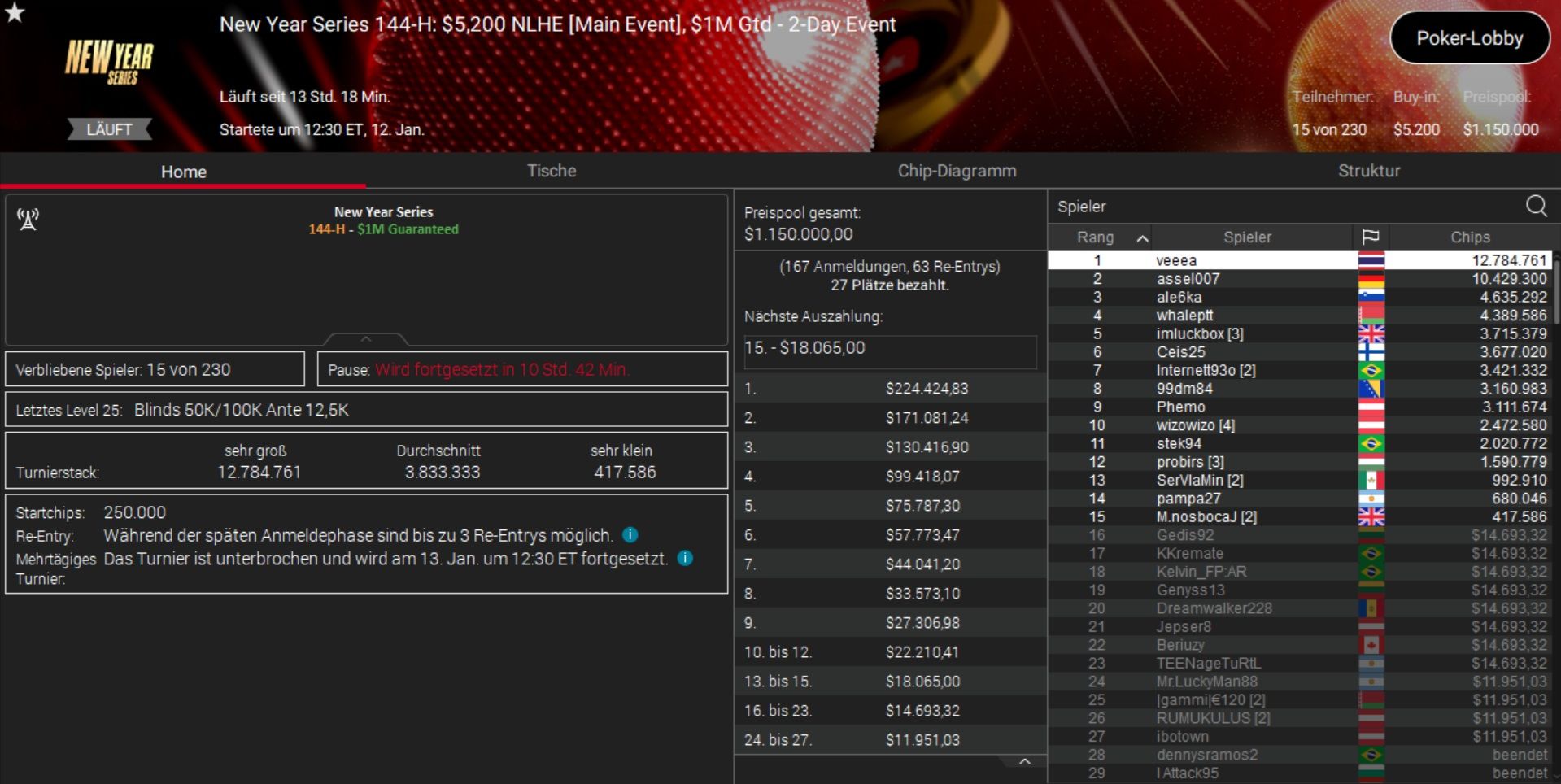 Nach Tag 1 sind auch noch bei allen drei Main Events der New Year Series DACH-Vertreter im Rennen. In der höchsten Kategorie mit $5.200 Buy-In sind dies „Asse07“, „Phemo“ und Ole „wizowizo“ Schemion.