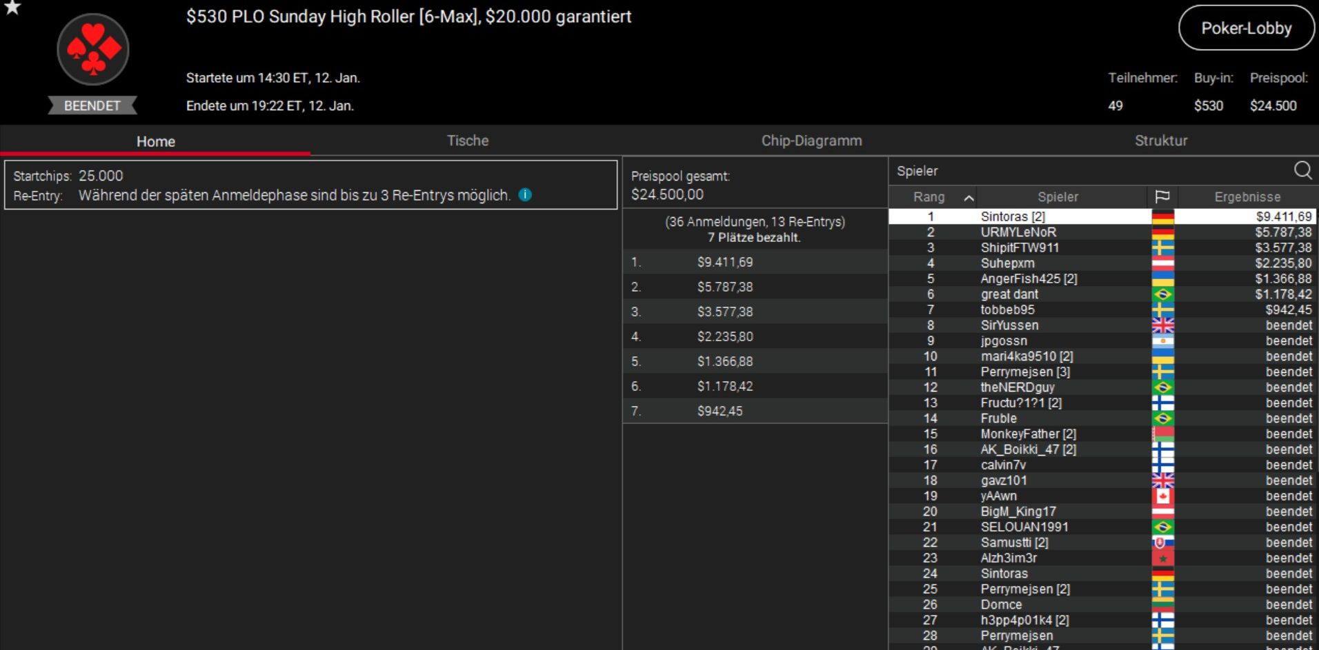 Den zweiten DACH-Erfolg holte Online-Legende „Sintoras“ beim $530 PLO High Roller. Er ließ 48 Konkurrenten, darunter Landsmann „URMYLeNoR“ als Zweiten, hinter sich und nahm über $9.000 Preisgeld mit.